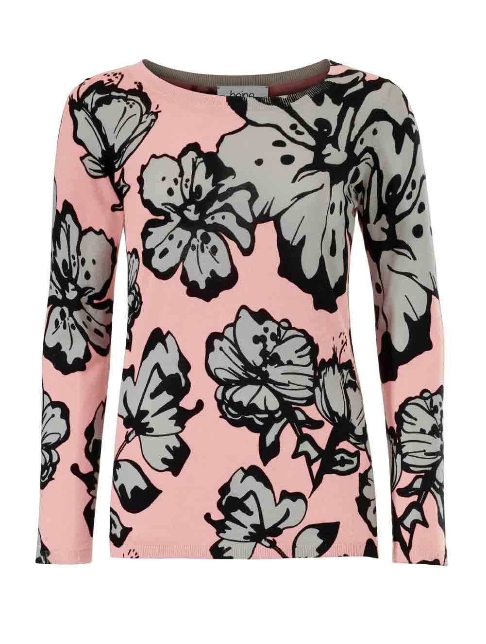 Extraheißer Flirt mit Feinstrick. Eyecatcher-Pullover von Heine mit auffallend schönem Allover-Muster-Print in trendigem Blumen-Dessin. Figurbetonte Silhouette mit geripptem Rundhalsausschnitt, langen Raglanärmeln und schmalen Rippenstrickbündchen. Довжина ca. 64 cm. Trageangenehme, softe Feinstrick-Qualität aus 60% Viskose/40% Baumwolle.