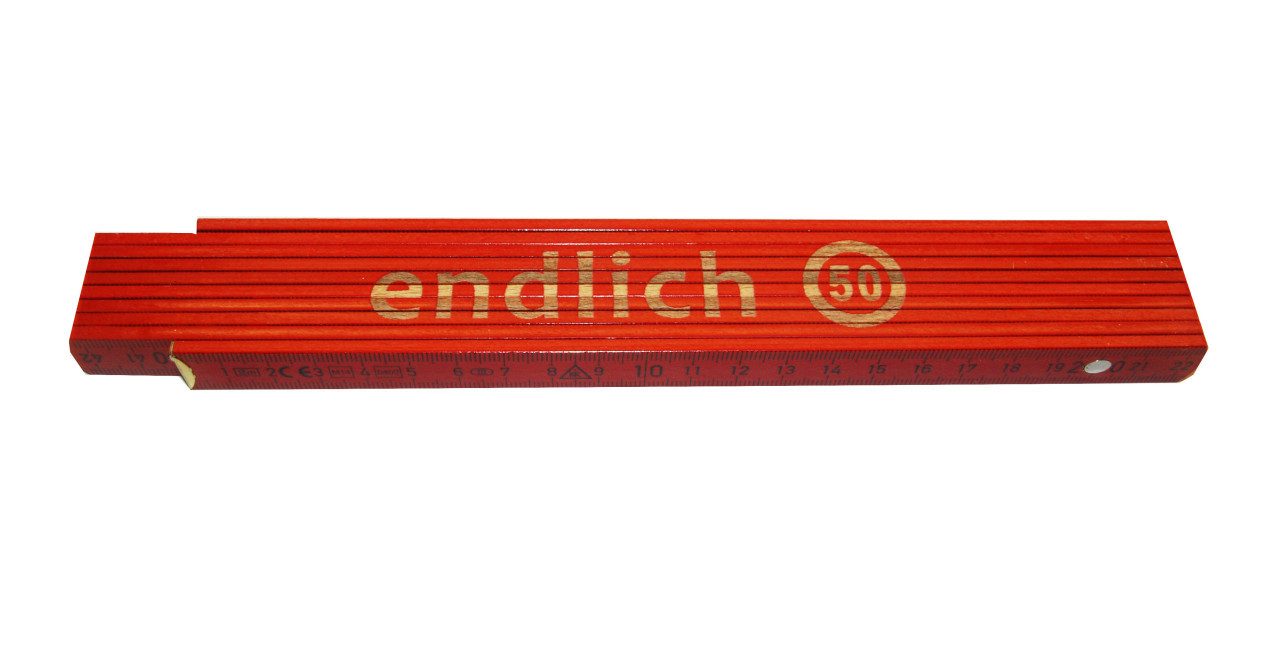 Produktdetails: Aufdruck: "Endlich 50" | Довжина: 2 m | Breite: 17 mm | 10 Glieder à 3 mm Stärke | Genauigkeitsklasse 3 | Maßeinteilung:Zentimeter, zweiseitig | Material: Buchenholz | Beschriftung: gelasert | Farbe: rot | Gewicht: 107 g |