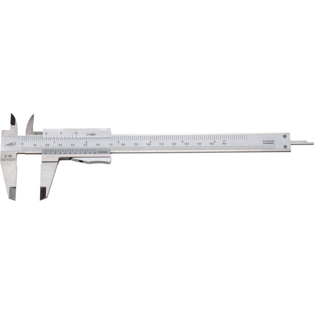Eigenschaften | Ablesung: 0.05 mm · DIN-Norm: DIN 862 · Gewicht: 140 g · Material: Stahl · Material-Eigenschaft: rostfrei, matt verchromt · Messbereich (max.): 150 mm · Schnabel-Довжина: 40 mm · Впередe technische Daten: Mit Momentfeststellung · kalibriert: Werksstandard (ohne Zertifikat) |