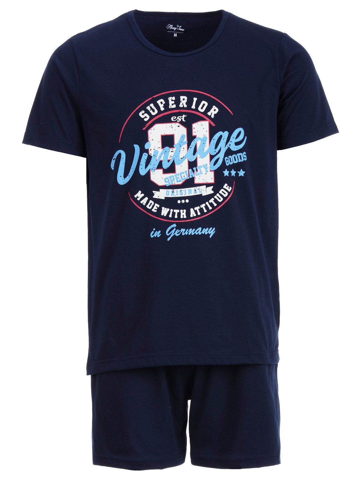 Modischer zeitloser Schlafanzug. Der Herrenschlafanzug ist angenehm auf der Haut zu tragen. Rundhalsausschnitt mit modernem Print. Die kurze unifarbene Schlafanzughose hat einen Dehnbund.