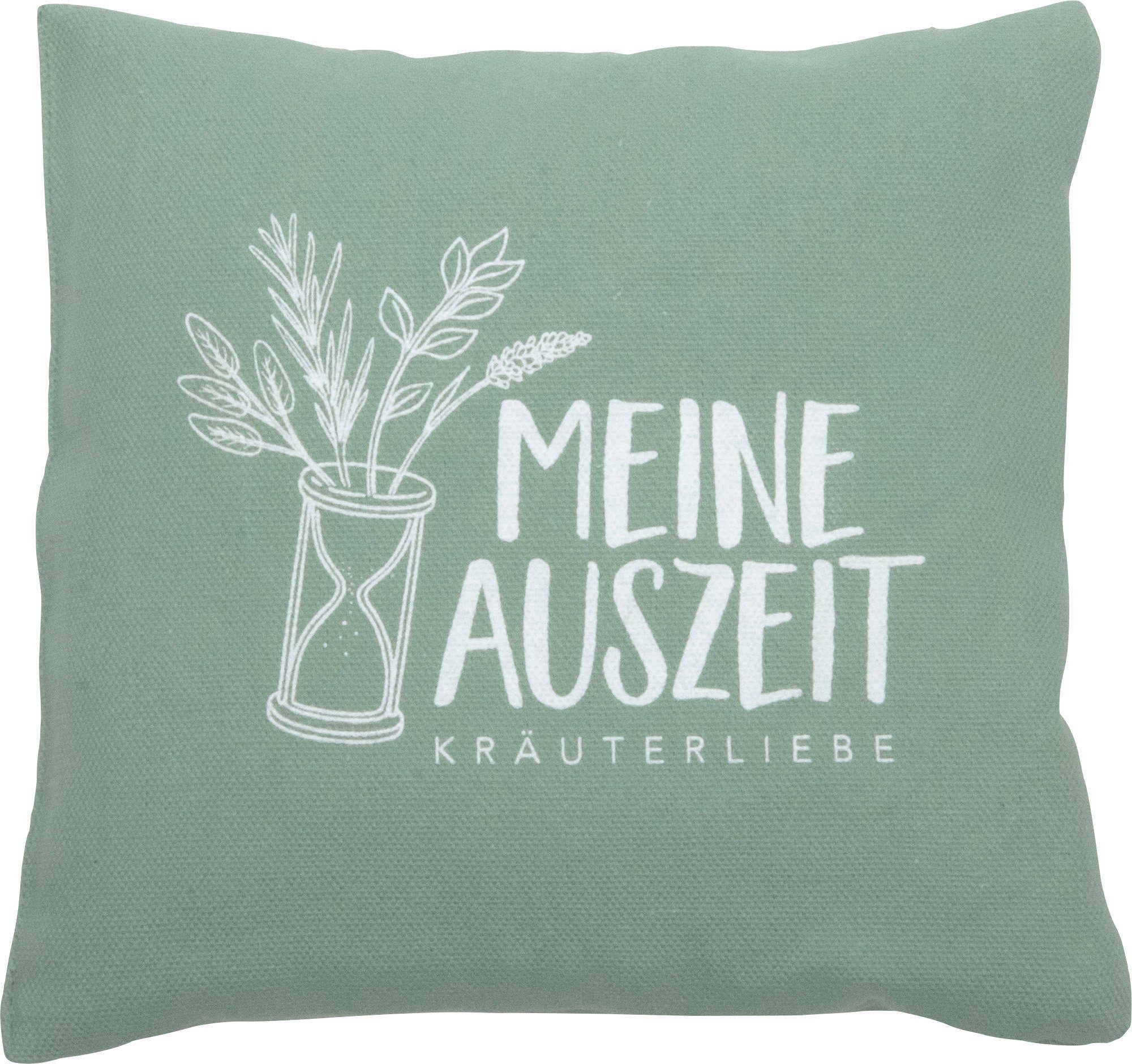 Herbalind Kräuterkissen "Auszeit". Holen Sie sich die Kraft der Natur ins Haus. Dieses Entspannungskissen hat einen robusten Baumwoll-Canvas-Bezug, der mit einem Schriftzug bedruckt ist. Seine Kräuterfüllung verbreitet ein aromatisches Dufterlebnis in Ihrem Ambiente. Denn zusätzlich zu Schafschurwolle und Dinkelspelz enthält es eine Kräutermischung, bestehend ausThymian, Salbei, Lavendel, Pfefferminz, Eukalyptus, Hopfenzapfen, Kamille, Anis, Fenchel und Steinkleekraut. Diese kann durch ihre beruhigende Wirkung beim Relaxen oder Einschlafen hilfreich sein. Dazu wird das Kissen direkt auf die Brust oder auf das Kopfkissen gelegt. Durch die Körperwärme können sich die ätherischen Öle der Kräuter besonders gut entfalten und auf natürliche Weise positiv auf Ihr Wohlbefinden einwirken. Das Kissen darf nicht erhitzt werden!
