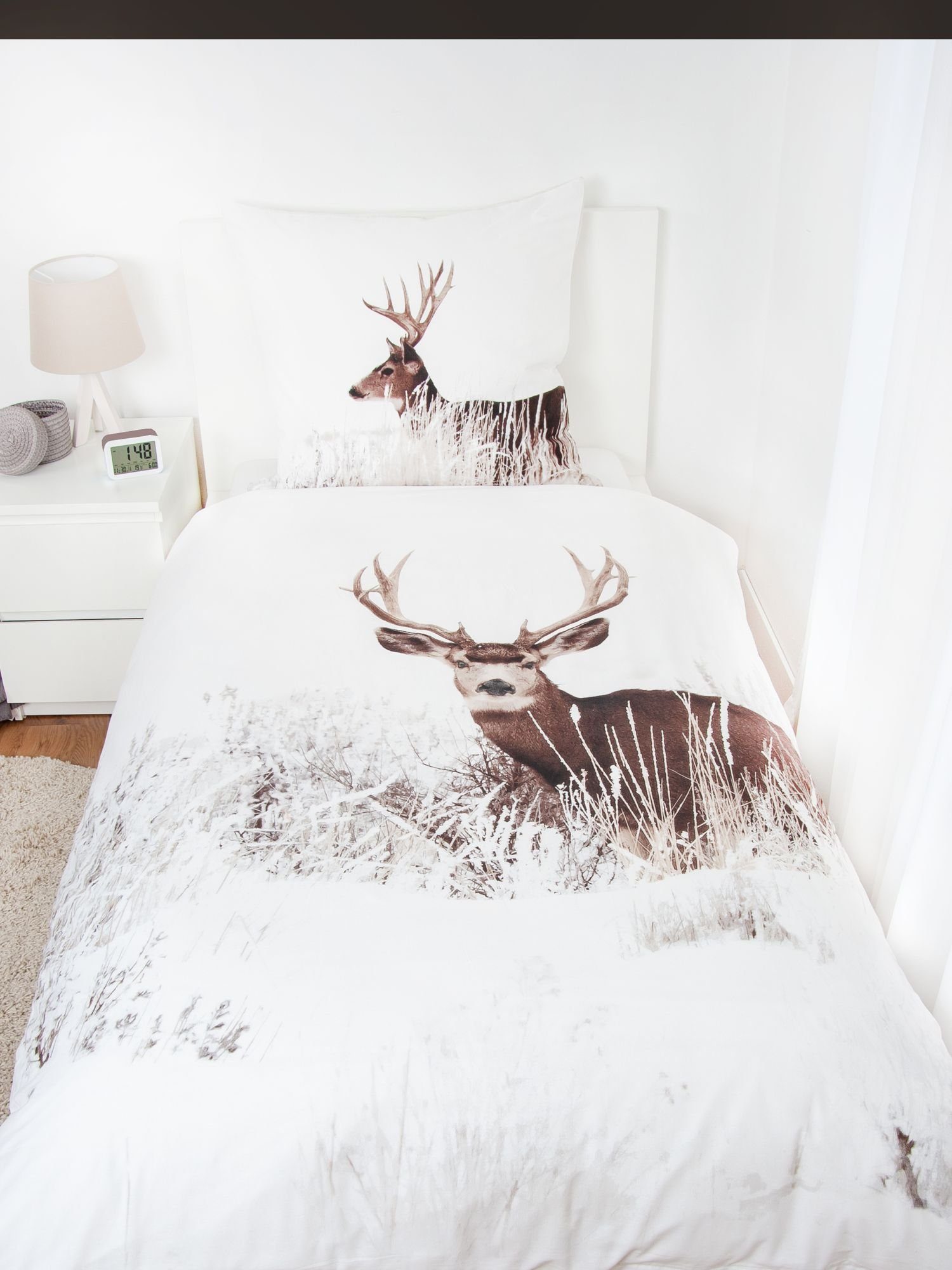 Herding Bettwäsche Flanell Bettwäsche Set Winterlandschaft Hirsch 2tlg. Biber 155x220 cm