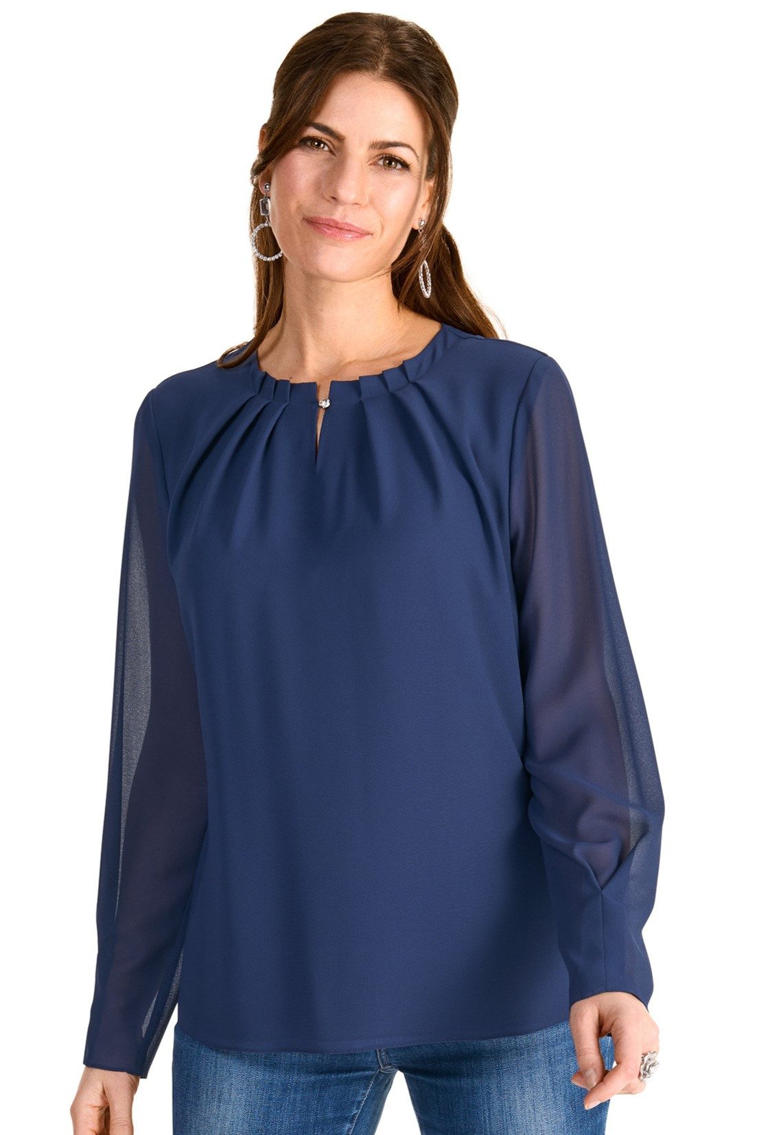Mit der Langarmbluse von HERMANN LANGE Collection stellst du im Handumdrehen ein neues Outfit zusammen. Durch den Zierknopf wirkt sie raffiniert und modern. Diese Bluse hat einen gerafften Rundhalsausschnitt und ist komfortabel geschnitten, sodass du dich wohlfühlst.