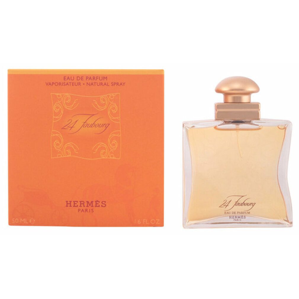Das Hermès 24 Faubourg Eau de Parfum 50 ml ist ein blumiger Damenduft mit einer eleganten und sinnlichen Aura. Die Kopfnote aus fruchtiger Orange, saftigem Pfirsich, Heliotrop, belebender Bergamotte und Ylang - Ylang geht über in ein Herz aus Iris, zarter Orangenblüte, Gardenie und Jasmin. Die Basis aus Sandelholz, Ambra, Patchouli und cremiger Vanille rundet den Duft optimal ab und unterstreicht die sinnliche Signatur. Der luxuriöse und sehr weibliche Duft kommt in einem besonders edlen Flakon.