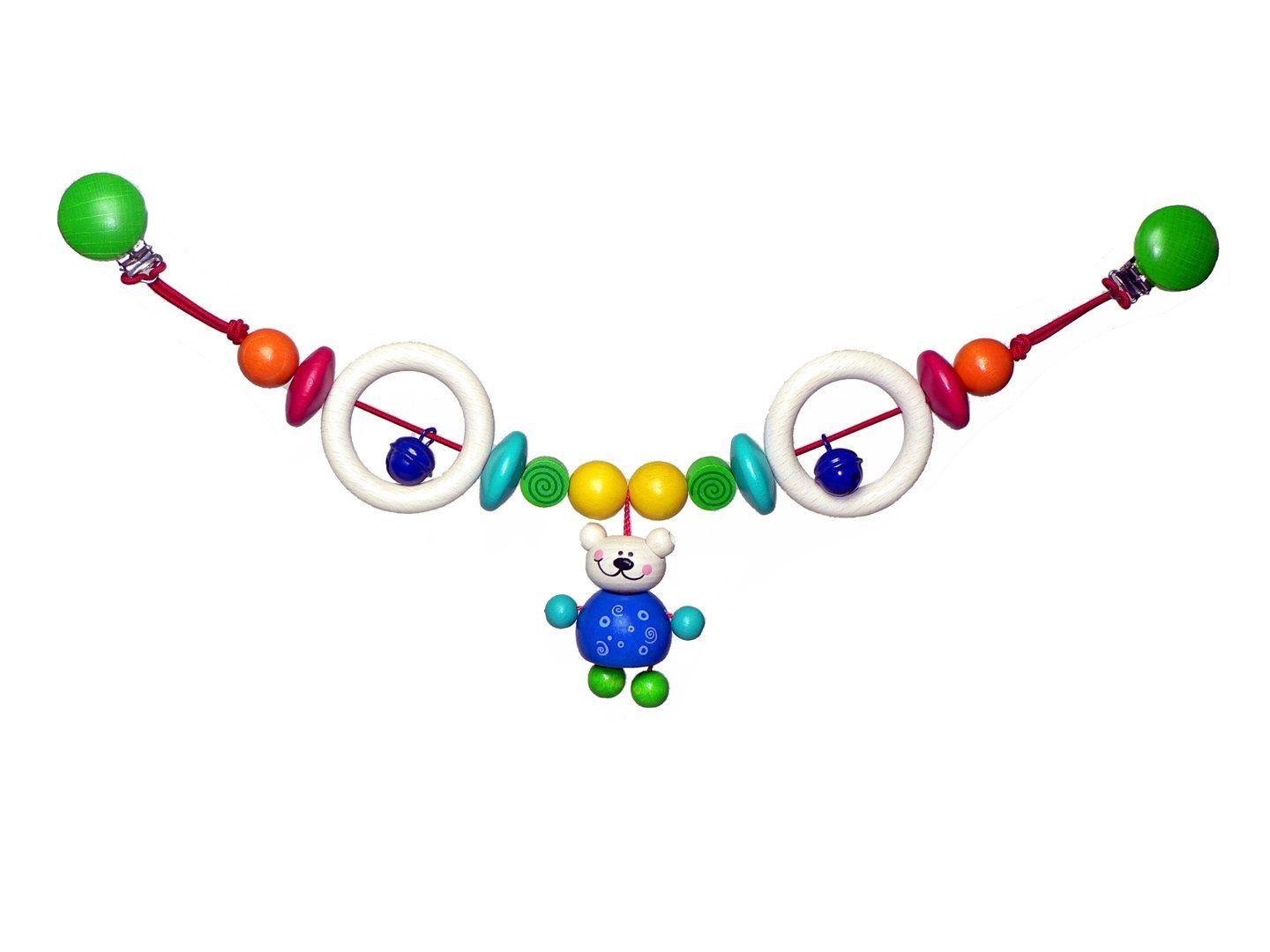Babyspielzeug Kinderwagenkette Bär Tim Schöne Kinderwagenkette mit verschiedenen Holzteilen, Scheiben, Perlen und einem Teddy in der Mitte. Zwei Ringe besitzt zusätzlich noch ein kleines Glöckchen. Всі Teile bestehen aus Buchenholz und sind teilweise bunt lackiert mit Farben die auf Wasserbasis und lösungsmittelfrei basieren. An der Schnur befindet sich links und rechts ein Metallclip mit denen man die Kette ganz leicht am Kinderwagen an den Seiten der Abdeckung befestigen kann BxLxH 520x40x120mm NEU |