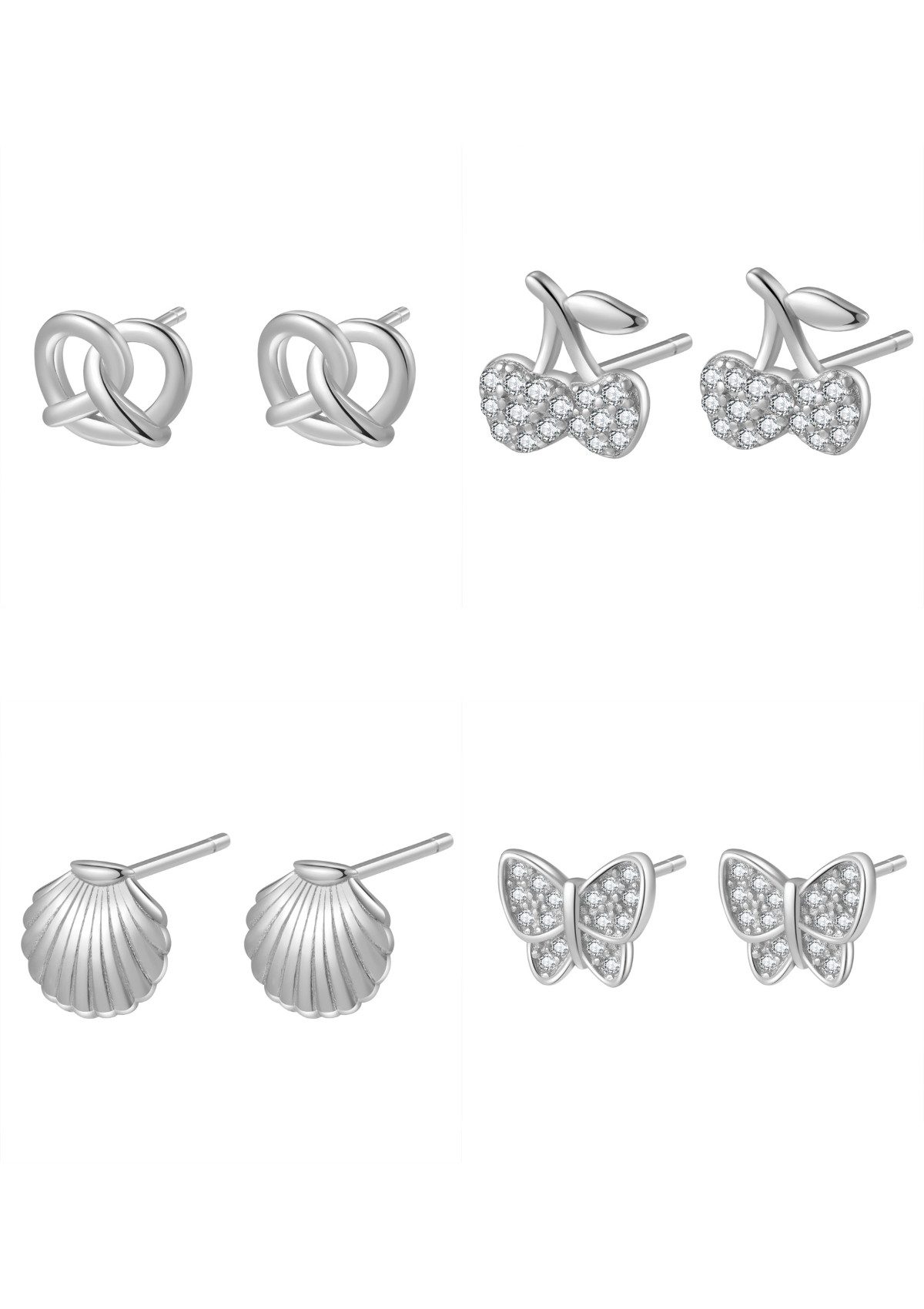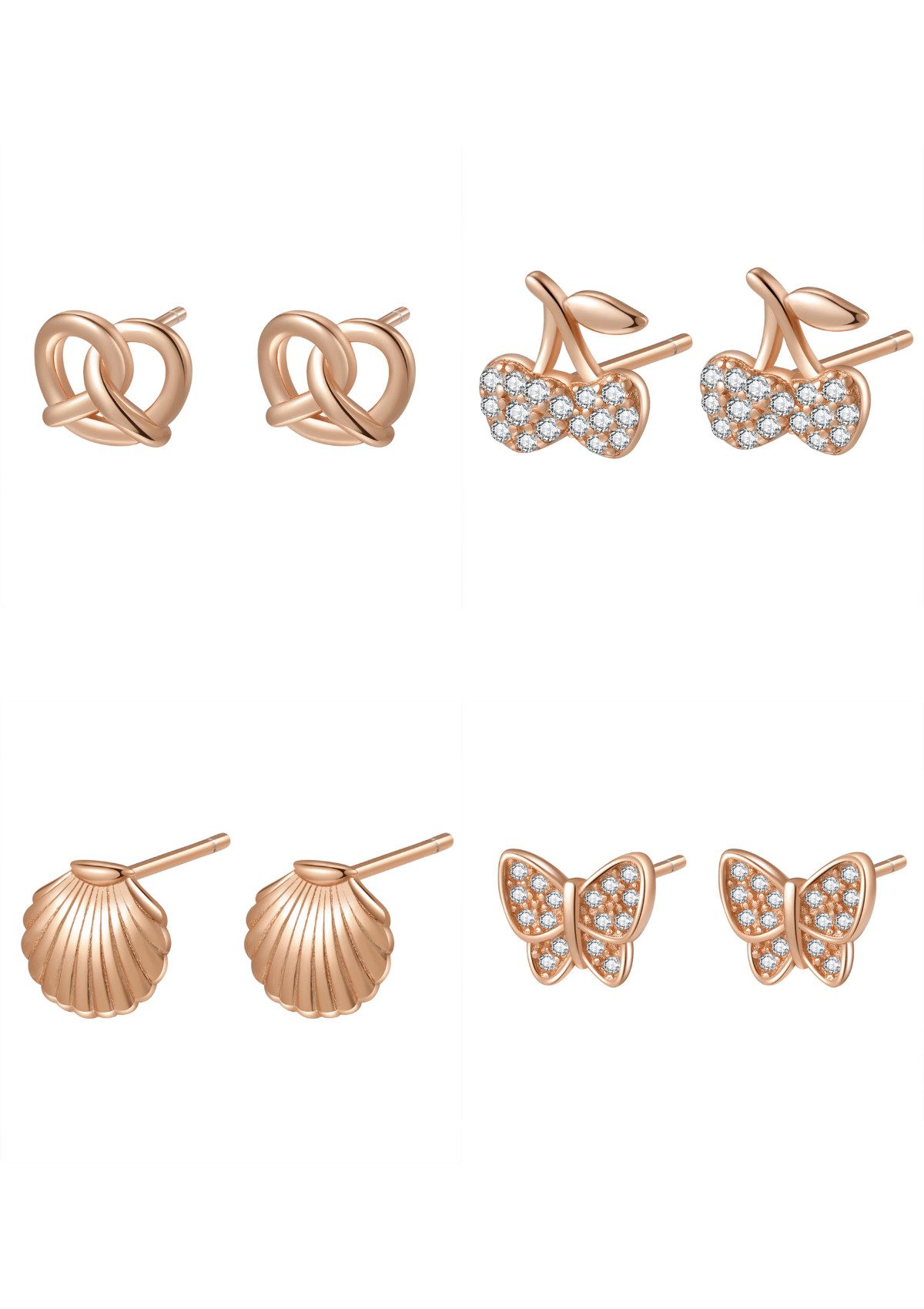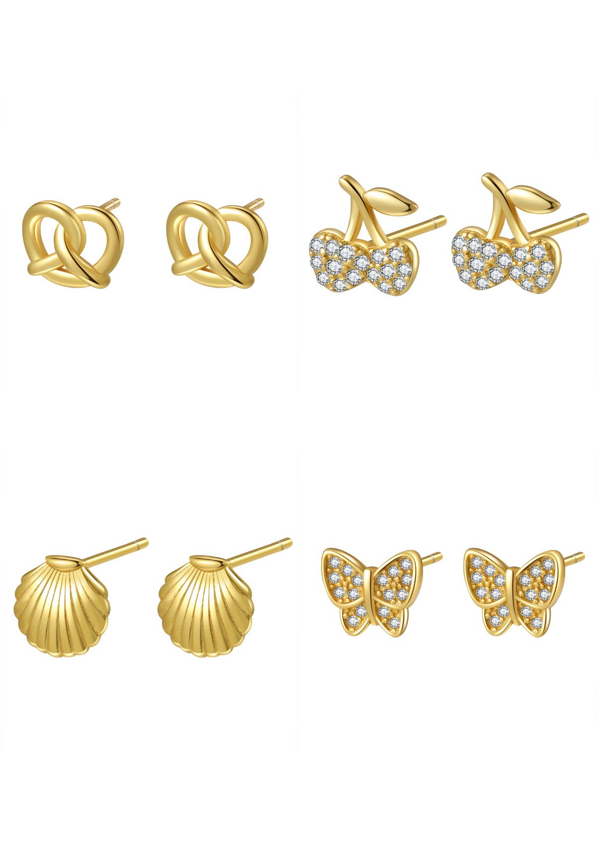 Das verspielte Ohrringset ist die perfekte Ergänzung für Ihre Schmuckkollektion. Dieses Set enthält 4 Paar Ohrstecker mit lustigen und einzigartigen Designs wie Schmetterling, Kirsche, Jakobsmuschel und Brezel. Diese Ohrringe sind in Gold, Roségold und Silber erhältlich und sind eine stilvolle Möglichkeit, Ihr Outfit aufzuwerten.