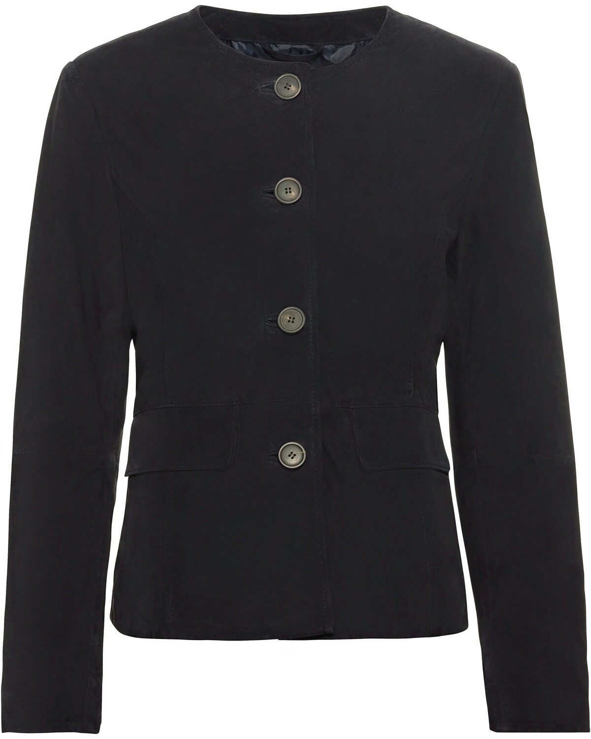 Vielseitig kombinierbar und besonders langlebig Diese Lederjacke ist nicht nur ein stilvoller Hingucker, sondern lässt sich auch hervorragend mit verschiedenen Outfits kombinieren. Ob zu Jeans oder Kleid, sie passt sich problemlos verschiedenen Stilrichtungen an und bleibt dabei stets ein zeitloser Klassiker. Die robuste Qualität des Ziegenveloursleders sorgt dafür, dass die Jacke lange Freude bereitet und viele Saisons überdauert. Oberstoff: 100% Leder; Futter: 100% Polyester. Dieser Artikel enthält nichttextile Teile tierischen Ursprungs.