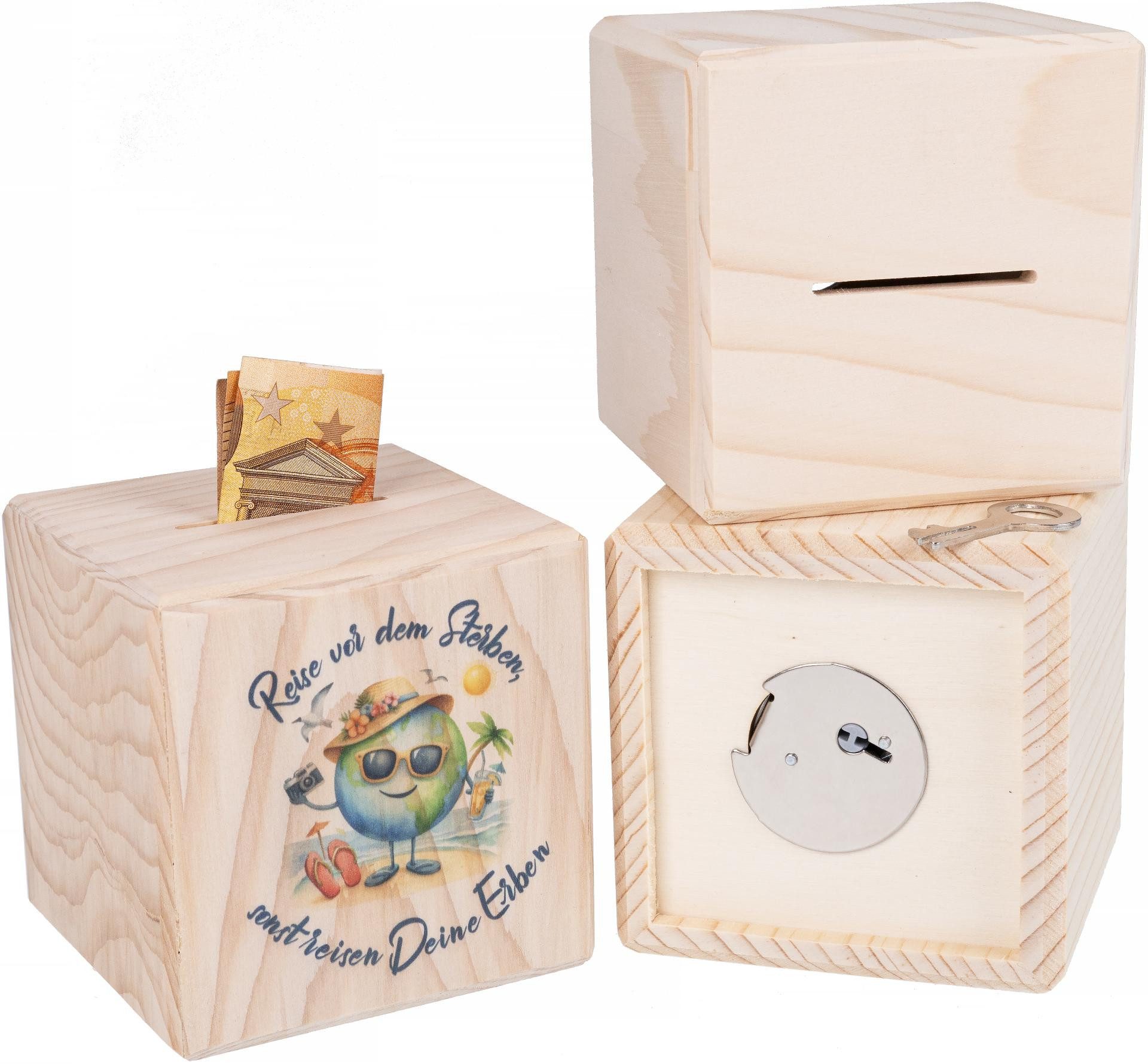 Diese Holz Spardose "Globetrotter" ist mehr als nur ein Sparbehälter; sie ist ein Symbol für die Freiheit, die Welt zu erkunden und für die Verwirklichung eigener Träume und Wünsche zu sparen.