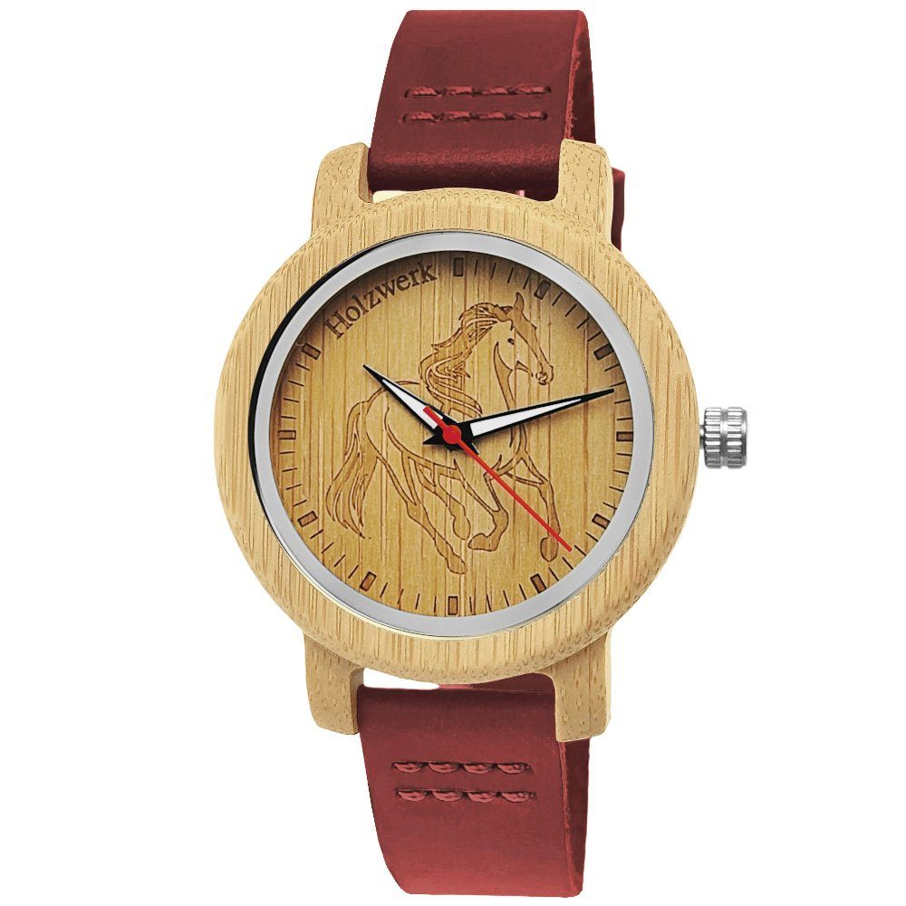 Kinder werden begeistert sein von dieser trendigen Holzwerk Kinderuhr Modell: LIL TORI RED, mit dem robusten dunkelroten Echtleder-Armband und stabilen Uhrengehäuse aus Holz. Das Zifferblatt mit dem Pferd Muster machen die Uhr zu einem coolen Accessoire, welches Kinder lieben werden!