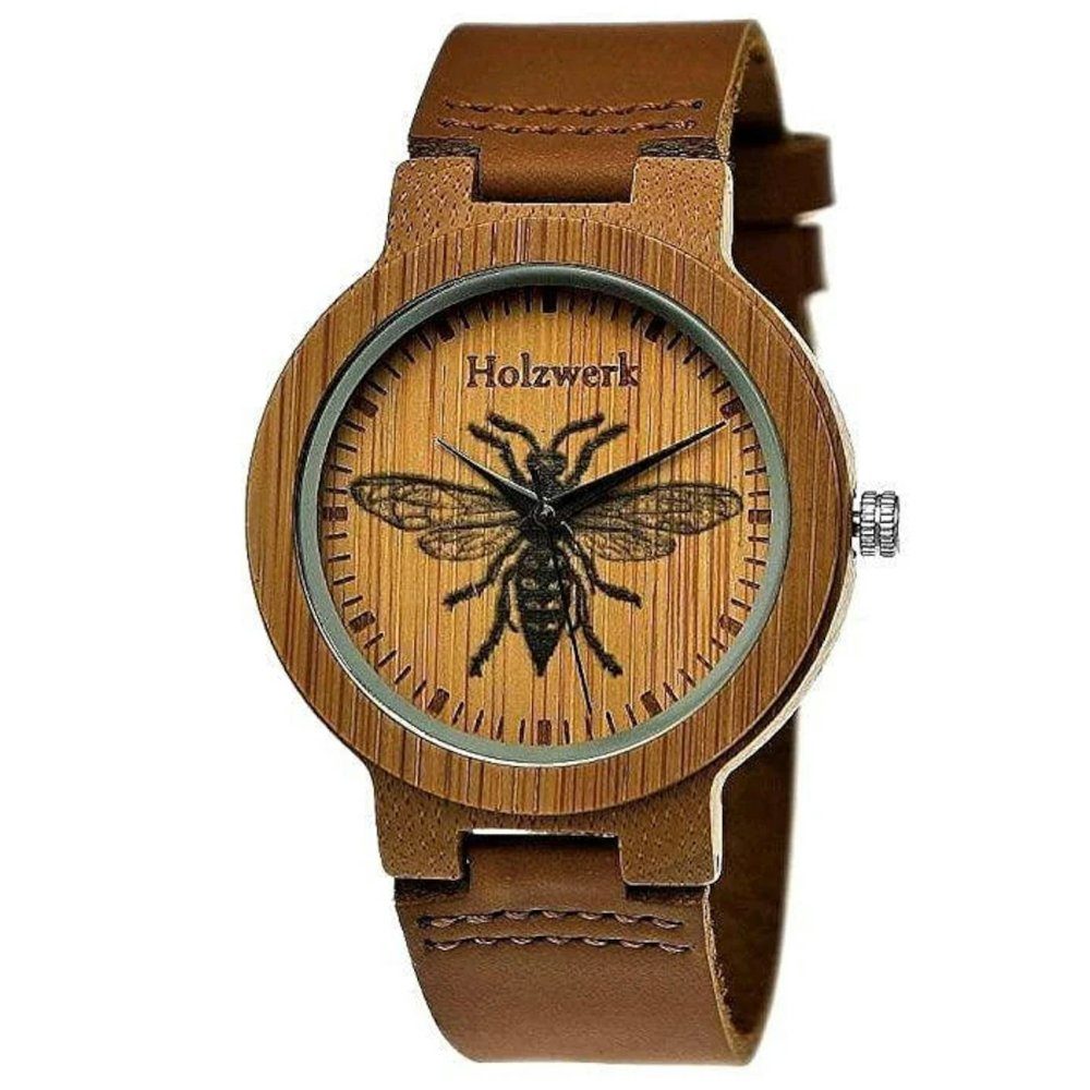 Die Holzwerk-Armbanduhr Modell: MY BEE ist eine der besonderen Art. Das Zifferblatt ist mit einem kunstvollen Bienenmuster versehen und wird von einem massiven Holzgehäuse und einem robusten Echtleder-Armband umrahmt. Das Design ist einzigartig und inspirierend. Holzliebhaber werden von dieser Uhr begeistert sein. Diese Holzwerk Quarzuhr ist nicht nur ein Accessoire, sondern auch ein Statement.