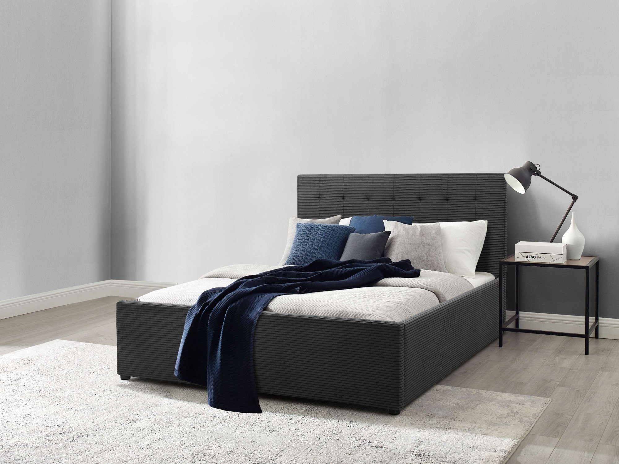 Das Bettgestell besteht aus modernem Holzwerkstoff und ist daher sehr formstabil und tragfähig. Der Strukturstoff des Bezugs zeigt sich durch die miteinander verwobenen Faserstränge mit einer charakteristischen Oberfläche.