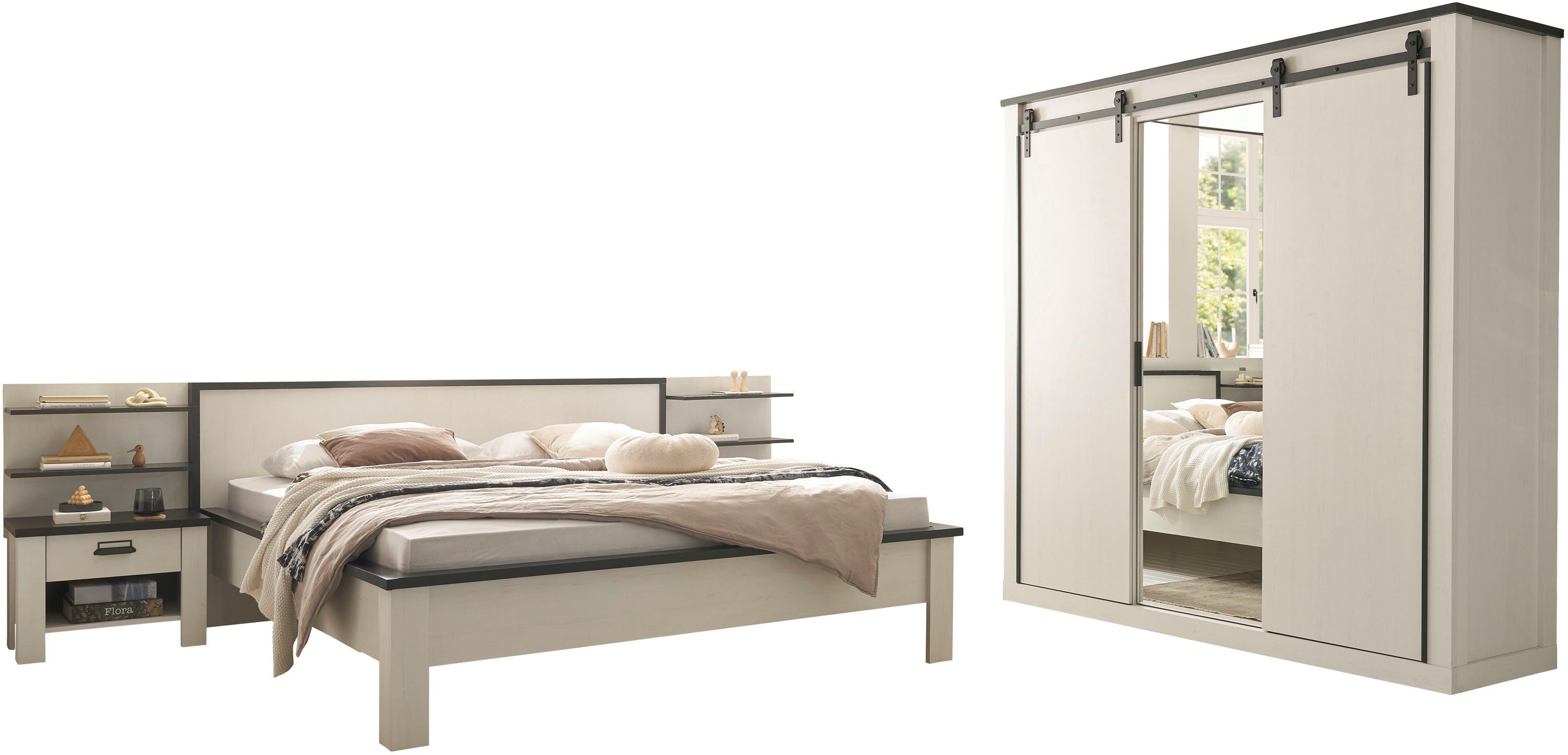 Set beinhaltet | Set, 6tlg. bestehend aus: · 1 Bett Liegefläche 180x200cm · 1 Kleiderschrank 3-türig mit 2 Schiebetüren und 1 verspiegelte Drehtür · 2 Nachttische · 2 Wandregale Details der Einzelartikel: Bett: · Liegefläche: 180/200 cm: Außenmaße (B/T/H): 195/213/93 cm · Einlasstiefe 15, 17, 19 oder 22 cm · Höhe Bettseite 45cm · Höhe Füße 46cm · Bodenfreiheit 20cm Nachttisch: · 1 Schublade und 1 offenes Ablagefach · Schubladeninnenmaße (B/T/H): ca. 36/28/10 cm · Fachinnenmaße (B/T/H): ca. 42/32/15 cm · Gesamtmaße (B/T/H): ca. 60/39/46 cm · Schublade mit Soft-close-Funktion Wandpaneel: · 2 Regalablagen · Ablagefläche (B/T): ca. 59/20 cm · Belastbarkeit je Boden 5kg · Belastbarkeit gesamt 10kg · Gesamtmaße (B/T/H): ca. 60/22/54 cm Kleiderschrank: · Gesamtmaße (B/T/H): ca. 201/63/209 cm · Mit 2 Schubladen, 2 Kleiderstangen und 5 Einlegeböden · Schubladen und Türen mit Soft-close-Funktion Material: · Material FSC-zertifizierter Holzwerkstoff · Oberfläche melaminbeschichtet Informationen zu Lieferumfang und Montage: · Ohne Lattenrost, Matratzen und Bettwaren · Всі Maße sind ca.-Maße · Selbstmontage mit Aufbauanleitung Pflegehinweise: · Pflegehinweise für Möbel aus Holzwerkstoffen (inklusive Melamin und MDF): Verwenden Sie zur Pflege Ihrer Möbel aus Plattenwerkstoffen am besten ein weiches, nicht fusselndes Tuch oder ein Ledertuch. Wischen Sie die Oberflächen leicht feucht ab. FSC®-zertifiziert: · Das Label des FSC® weist nach, dass Sie mit dem Kauf dieser Produkte vorbildlich Waldwirtschaft - nach den strengen ökologischen, sozialen und wirtschaftlichen Standards des Forest Stewardship Council® - fördern und die Waldressourcen schonen. |