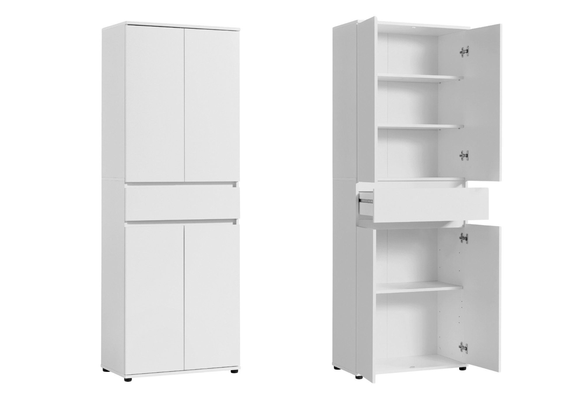 Im oberen Bereich befinden sich zwei Türen mit zwei Einlegeböden, die sich ideal für Putzmittel, Haushaltswaren oder Aktenordner eignen. Die mittig platzierte Schublade bietet den perfekten Platz für kleinere Gegenstände wie Schwämme, Lappen oder Büromaterial. Der untere Bereich verfügt über zwei weitere Türen mit einem zusätzlichen Einlegeboden, sodass größere Gegenstände wie Gesellschaftsspiele, Bücher oder Handtücher ihren Platz finden.