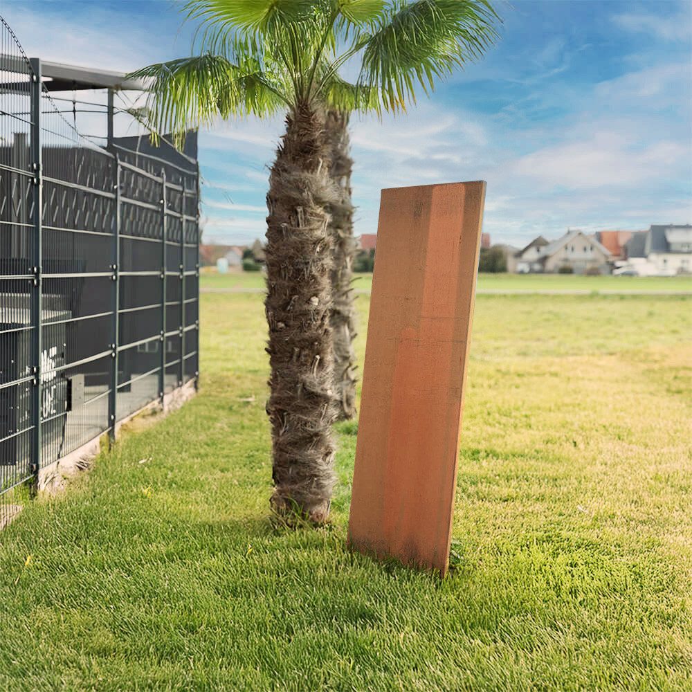 Gefertigt aus hochwertigem Cortenstahl, schützt er nicht nur vor neugierigen Blicken, sondern dient gleichzeitig als dekoratives Element. Die natürliche Rostoptik fügt sich harmonisch in jede Gartenlandschaft ein und entwickelt mit der Zeit eine einzigartige Patina – von leuchtendem Hellorange bis hin zu tiefem Dunkelbraun. AURA überzeugt durch seine Langlebigkeit und Wetterbeständigkeit. Jeder Sichtschutzzaun wird in sorgfältiger Handarbeit in Deutschland gefertigt und hält den unterschiedlichsten Witterungsbedingungen stand. Besonders hervorzuheben ist das zeitlos schlichte Design, das auf überflüssige Muster verzichtet und sich durch eine klare, reduzierte Formsprache auszeichnet. Diese Eleganz durch Minimalismus verleiht dem Sichtschutz eine moderne, ruhige Ausstrahlung, die sich dezent in verschiedenste Umgebungen einfügt – ob im gepflegten Stadtgarten, auf der Terrasse oder entlang stilvoller Grundstücksgrenzen. Auch in puncto Stabilität überzeugt AURA auf ganzer Linie: Vier integrierte, robuste Erdanker sorgen für eine besonders standsichere Bodenverankerung. Selbst bei starken Windlasten bleibt der Sichtschutz zuverlässig an Ort und Stelle und schützt dauerhaft vor dem Umkippen. Die Montage gelingt schnell und unkompliziert, sodass du im Handumdrehen mehr Privatsphäre und ein stilvolles Ambiente genießen kannst.