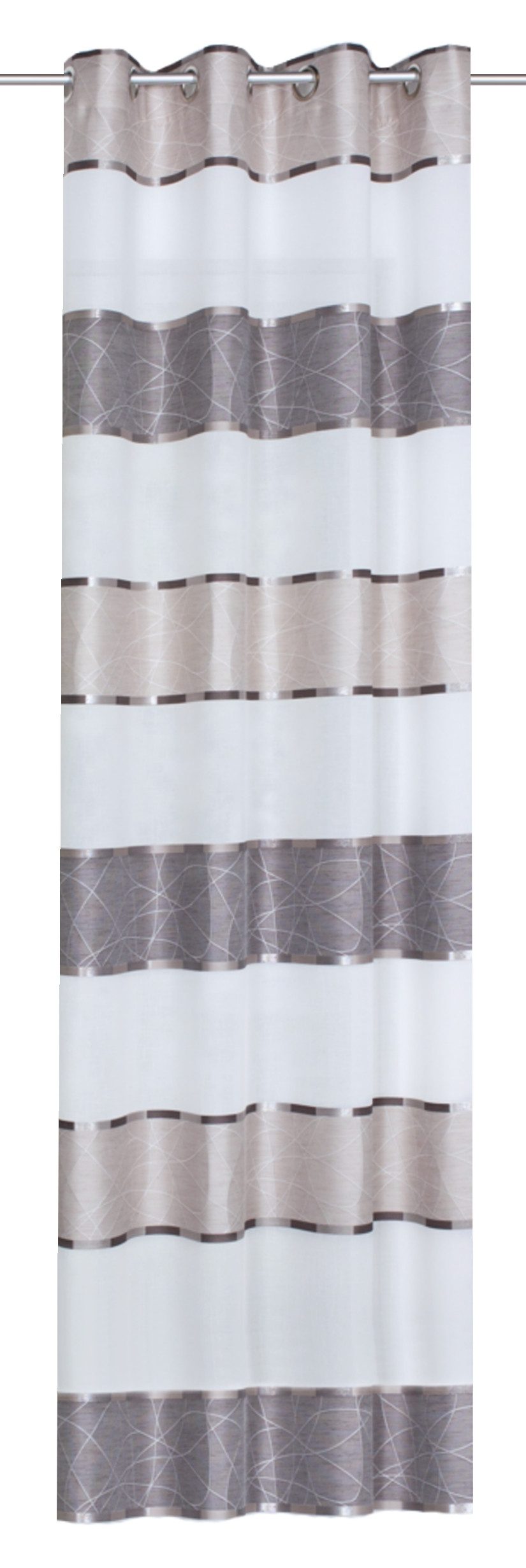 Застосуватиschal aus blickdichtem Dekostoff, jacquardgemustert mit hochwertigen Metallösen. Schöne farblich abwechsellnde Querstreifen, verschönern den Застосуватиschal. Ist die Gardine zu lang kann Sie, mit dem mit eingepacktem Bügelband, gekürzt werden, ohne Nähen. Einfach falten und aufbügeln. Der Schal besteht zu 100% aus Polyester. Lieferumfang: 1 Застосуватиschal inkl. 1 Bügelband mit Montageanleitung