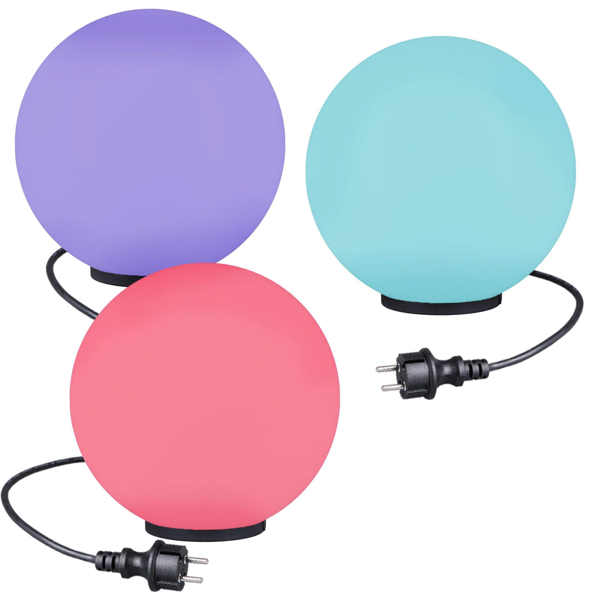 3x30cm Ø Kugelleuchte, 3x Bodenplatte inkl. Kabel, 3x RGB Leuchtmittel mit Fernbedienung, Gummifüße