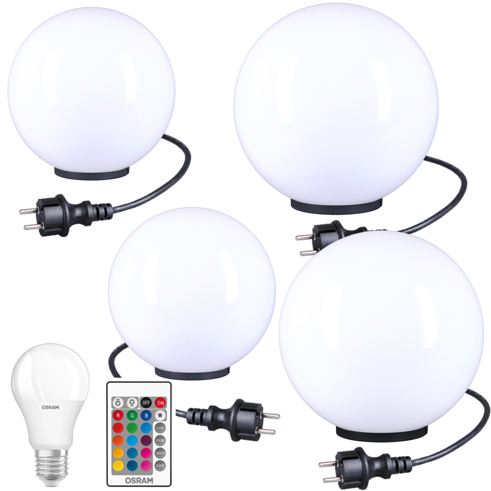 2x20cm / 2x30cm Ø Kugelleuchte, 4x Bodenplatte inkl. Kabel, 4x RGB Leuchtmittel mit Fernbedienung, Gummifüße