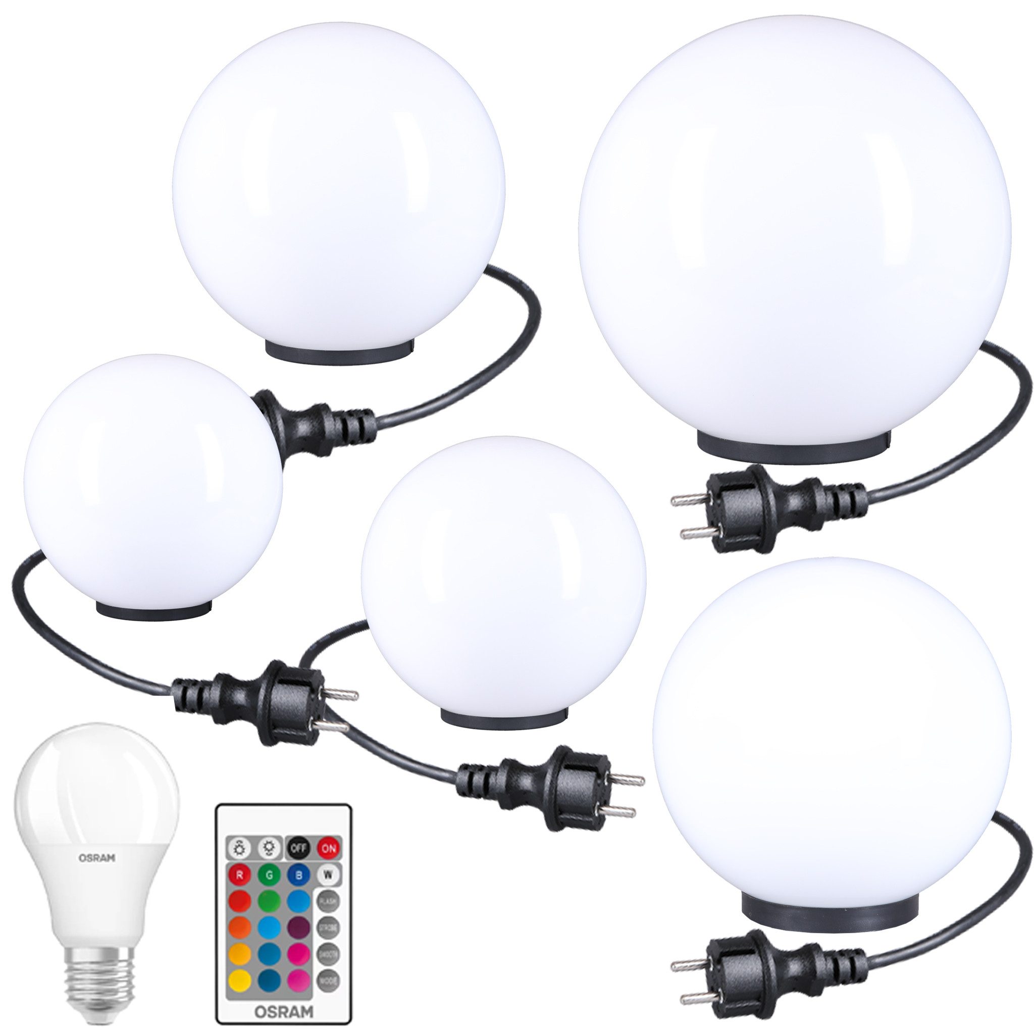 Je 1x 20/25/30/40/50cm Ø Kugelleuchte, 5x Bodenplatte inkl. Kabel, 5x RGB Leuchtmittel mit Fernbedienung, Gummifüße