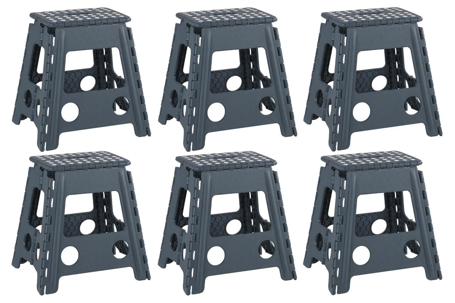 Das Klapphocker 6er Set von Home4You in Grau besteht aus sechs praktischen Tritthockern aus robustem Kunststoff. Mit einer Розмір von 29 x 22 cm und einer Höhe von 39 cm bieten sie eine stabile Trittfläche und sind bis zu 120 kg belastbar. Die Hocker lassen sich bei Nichtgebrauch platzsparend zusammenklappen und sind ideal für den flexiblen Einsatz in Haushalt und Garten. Ein praktisches Set für zusätzliche Erreichbarkeit auf kleinem Raum.