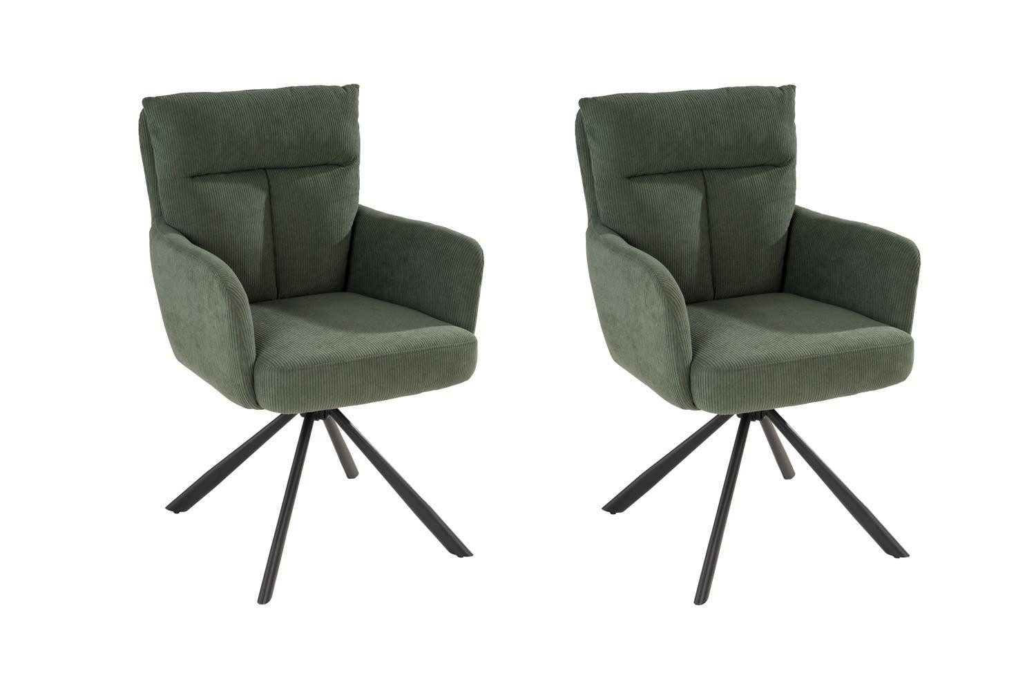 Die Polsterstühle von Home4You im 2er Set vereinen Komfort und modernes Design. Der grüne Cordbezug harmoniert perfekt mit dem schwarzen Metallgestell. Dank gepolsterter Armlehnen und einer Federkernpolsterung im Sitz bieten sie hohen Sitzkomfort. Die 180-Grad-Drehfunktion mit Rückholmechanismus sorgt für Flexibilität. Mit einer Sitzhöhe von 49 cm und einer Sitztiefe von 47 cm sind sie ideal für Esszimmer oder Büro.