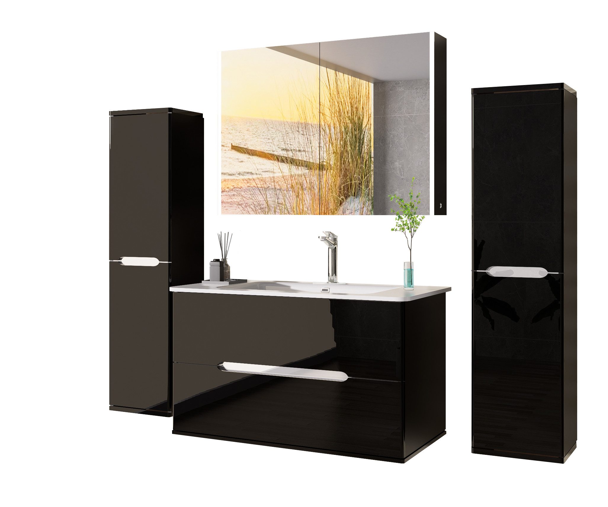 Traumhafte Badmöbel-Set. Sky in der neuen Ausführung Weiß / Schwarz Oder in Eiche/Weiß Die feine Äderung des Spiegelschrank sorgt für auffällige Reflexe, gleichzeitig schafft die durchgängige Gestaltung von Badezimmer optische Ruhe – zusätzlich unterstützt durch den Verzicht auf Griffe und die flächenbündige Integration des Hochschrank in pflegeleichtem felix Badmöbelset Hochglanz Bis 5 Teilig.