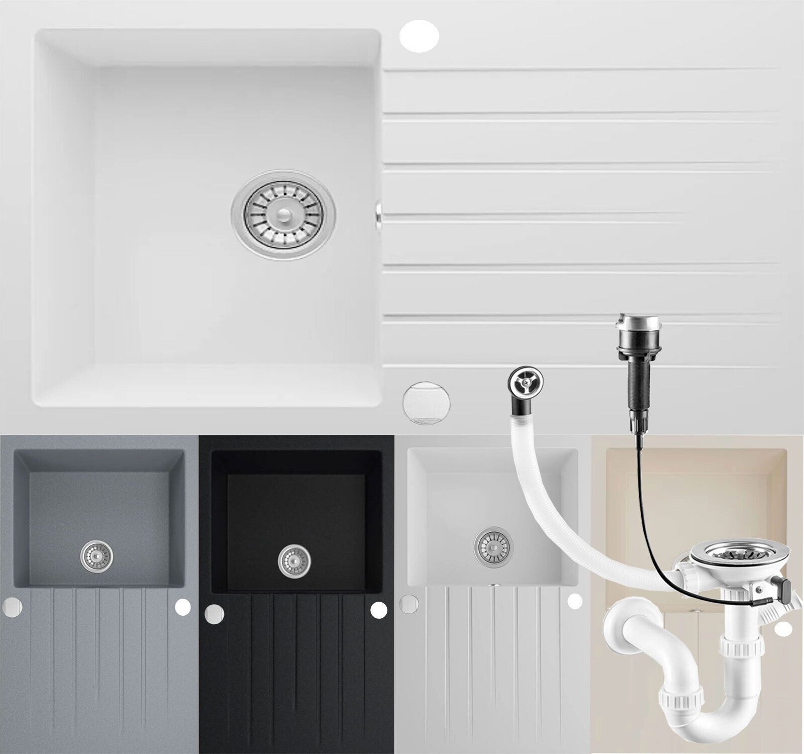 • Im Lieferumfang inbegriffen sind die Spüle, eine Excentergarnitur (Ab- und Überlauf), ein passender Siphon und eine bebilderte Montageanleitung samt Befestigungsmaterial. • Das handliche Design in fünf verschiedenen Farben und die beidseitige Montagemöglichkeit machen dieses Spülbecken zu einem Meisterstück.