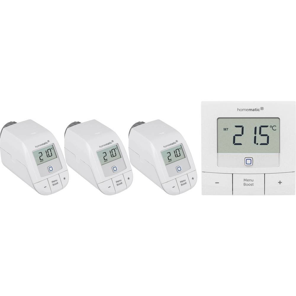 Lieferumfang | 3 x Homematic IP Heizkörperthermostat - basic, 3 x Adapter Danfoss RA, 3 x Stützring, 3 x Montagematerial, 6 x 1,5 V LR6/Mignon/AA Batterie, Homematic IP Wandthermostat - basic, Wandhalterung, 2 x Doppelseitige Klebestreifen, 2 x Schrauben, 2 x Dübel, 2 x 1,5 V LR6/Mignon/AA Batterien, Bedienungsanleitungen. |