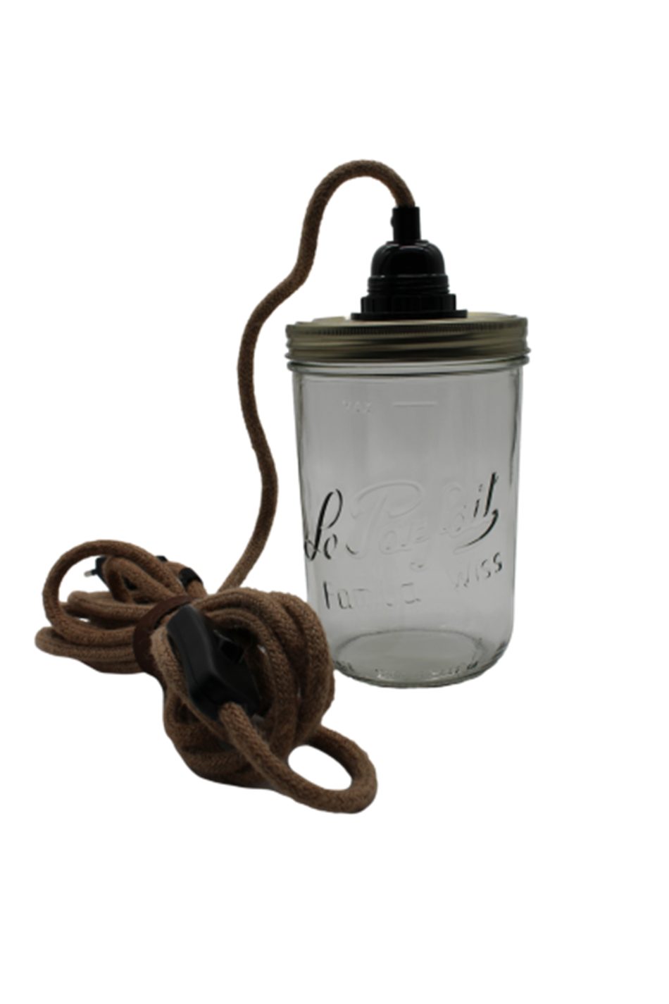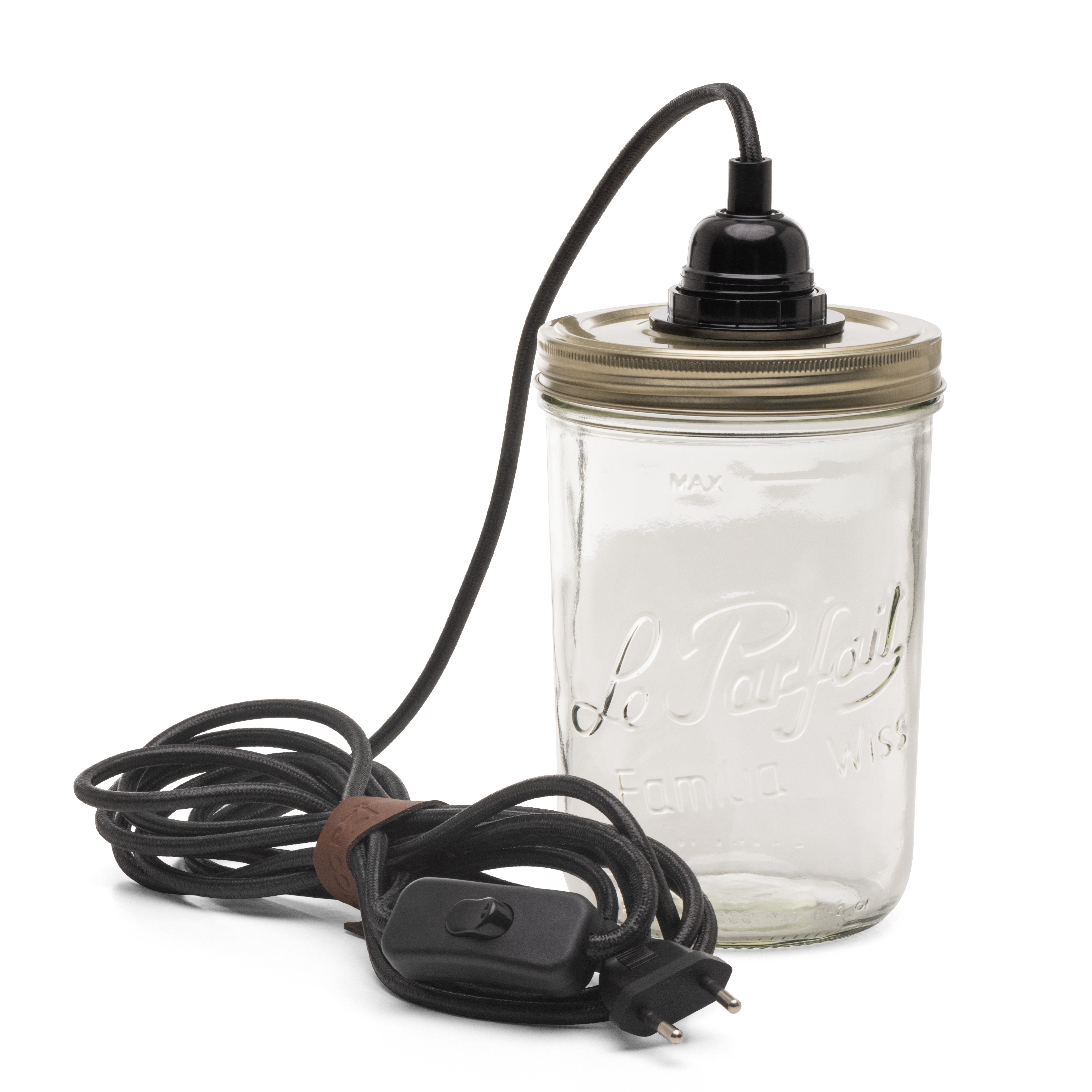 Das trendige transparente Einmachglas Le Parfait wird hier mit passendem Deckel in ein retro Lampenschirm umgewandelt. Es ist die Gewinnerkombination: ein ikonisches französisches Glas und ein moderner Touch mit Hoopzi-Leuchten.