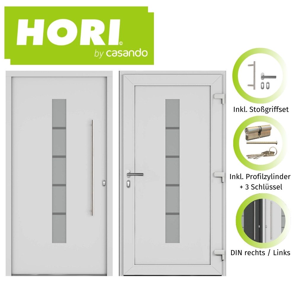 Diese HORI Aluminium Kunststoff Haustür in Weiß kombiniert hochwertige Materialien wie Kunststoff und Aluminium für maximale Langlebigkeit und Widerstandsfähigkeit. Mit den praktischen 350 mm Stoßgriff und Profilzylinder ist sie sowohl sicher als auch komfortabel zu bedienen. Die DIN links-Ausführung und die moderne Farbgebung passen perfekt in jedes Zuhause. Mit einem Gewicht von 60,97 kg bietet sie eine stabile und langlebige Lösung für Ihre Eingangstür.