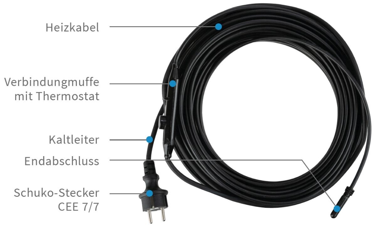 Der Heizkreis besteht aus einem selbstregulierenden Heizkabel mit einem Polyolefin-Außenmantel und ist mit einem Kaltleiter (2m Довжина) mit Stecker, einer Verbindungsmuffe mit integriertem Bimetall-Thermostat und einem Endabschluss versehen. Die werksseitig hergestellte, gegossene Verbindungsmuffe und der Endabschluss sind zuverlässig und dicht verschlossen.