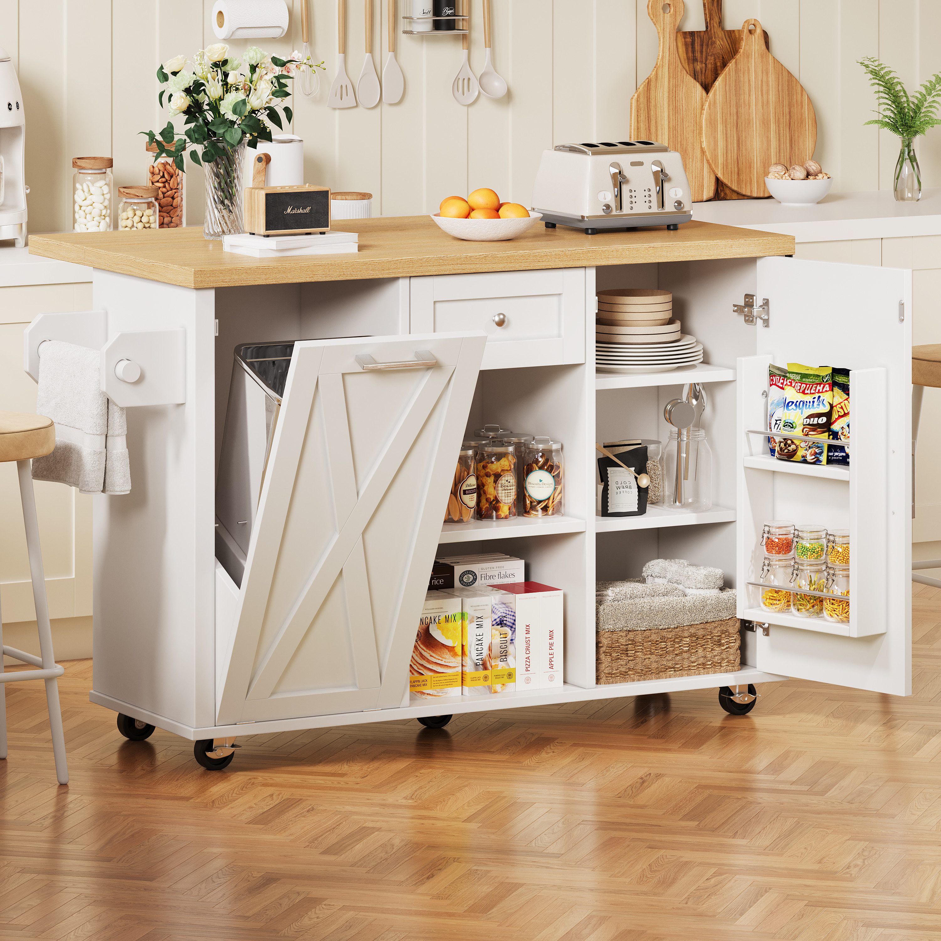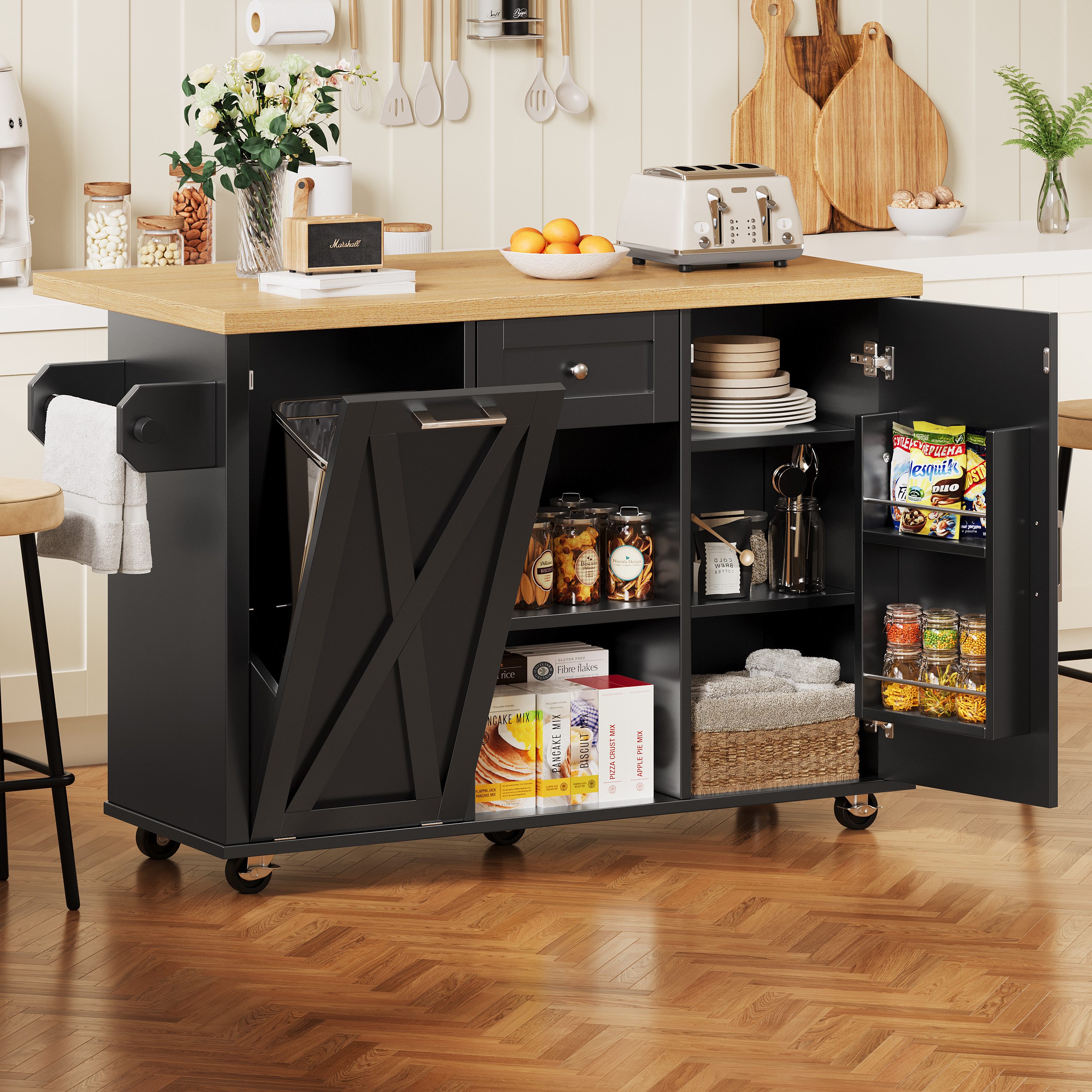 Feste Einlegeböden und integrierte Türablagen schaffen reichlich Platz für Küchenutensilien, Geschirr oder Bürobedarf – alles bleibt ordentlich und griffbereit.