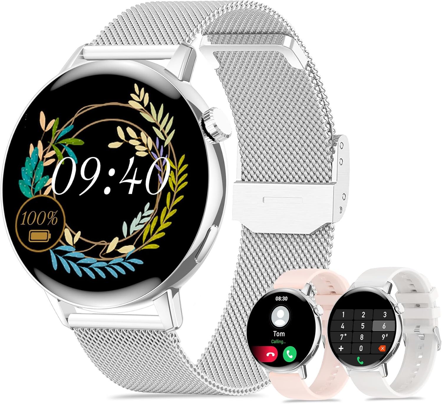 Die moderne Damen Smartwatch überzeugt mit einem ultra-dünnen Metallrahmen und einem hochauflösenden 1.32 Zoll HD-Farbdisplay. Dank über 200 Zifferblättern in der App und der Möglichkeit, eigene Fotos wie Familie oder Haustiere als Hintergrund zu wählen, passt sich die Uhr individuell an. Im Lieferumfang enthalten sind drei verschiedene Armbänder – ein edles Edelstahlarmband für den eleganten Look sowie zwei sportlich-leichte Silikonarmbänder, die sich perfekt für Alltag und Training eignen.