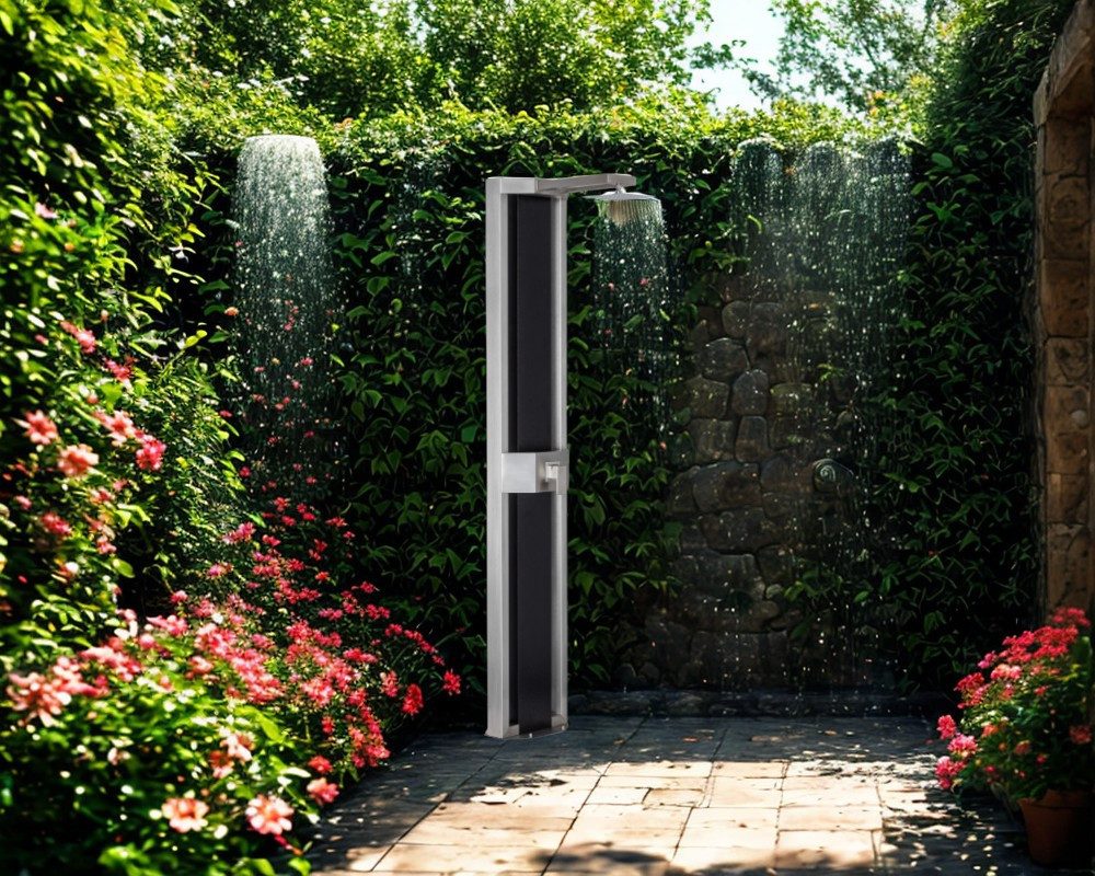 Die Solardusche ANTIGUA kombiniert erstklassige Qualität, Design und Technik. Die zentrale Anordnung des Solartanks und das moderne, klar strukturierte Design mit geraden Linien garantieren, dass das Wasser durch Sonnenlicht von zwei Seiten optimal erwärmt wird. Dies ermöglicht eine bessere Planung des Standorts im Garten und bietet einen effizienten Einsatz.