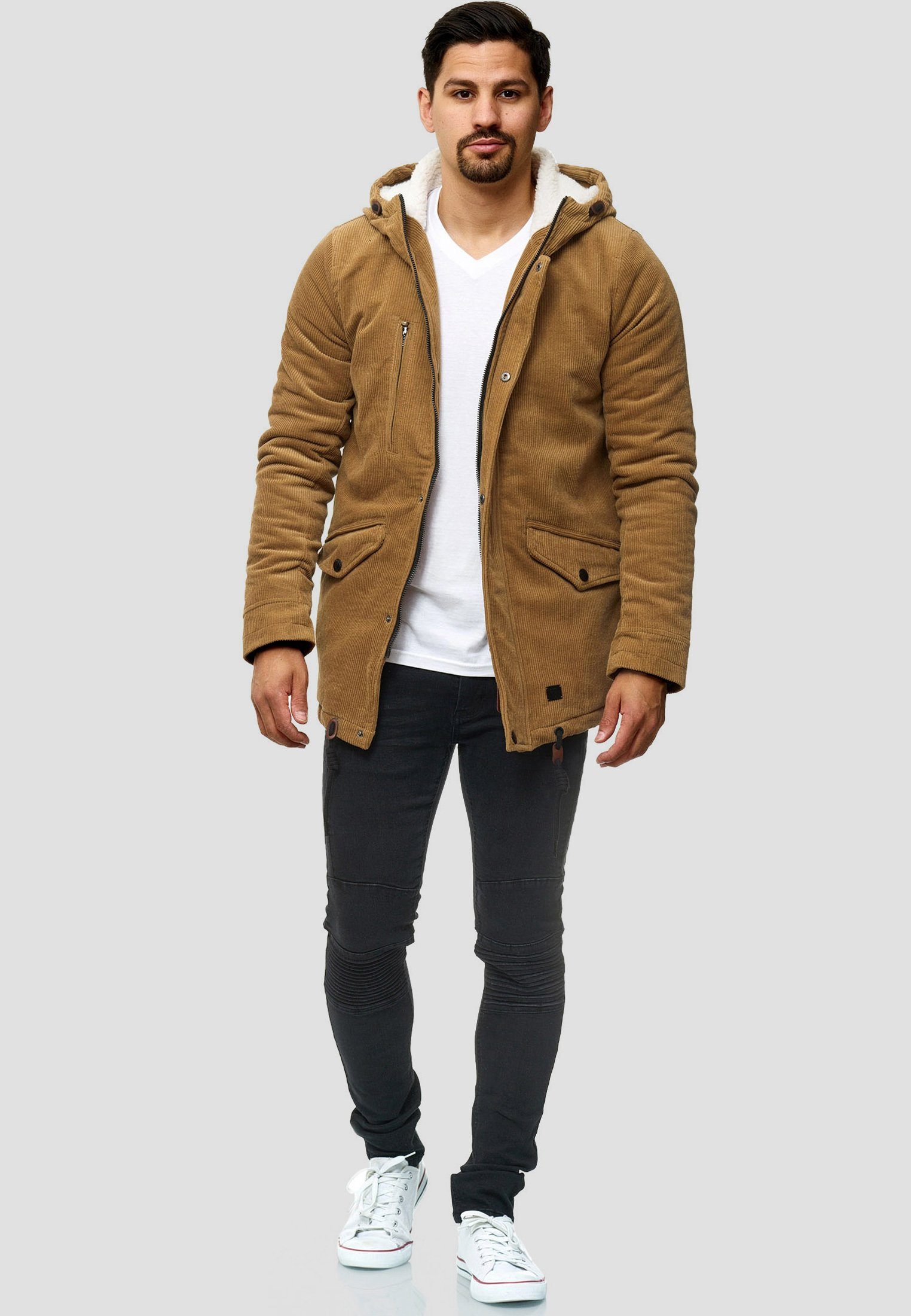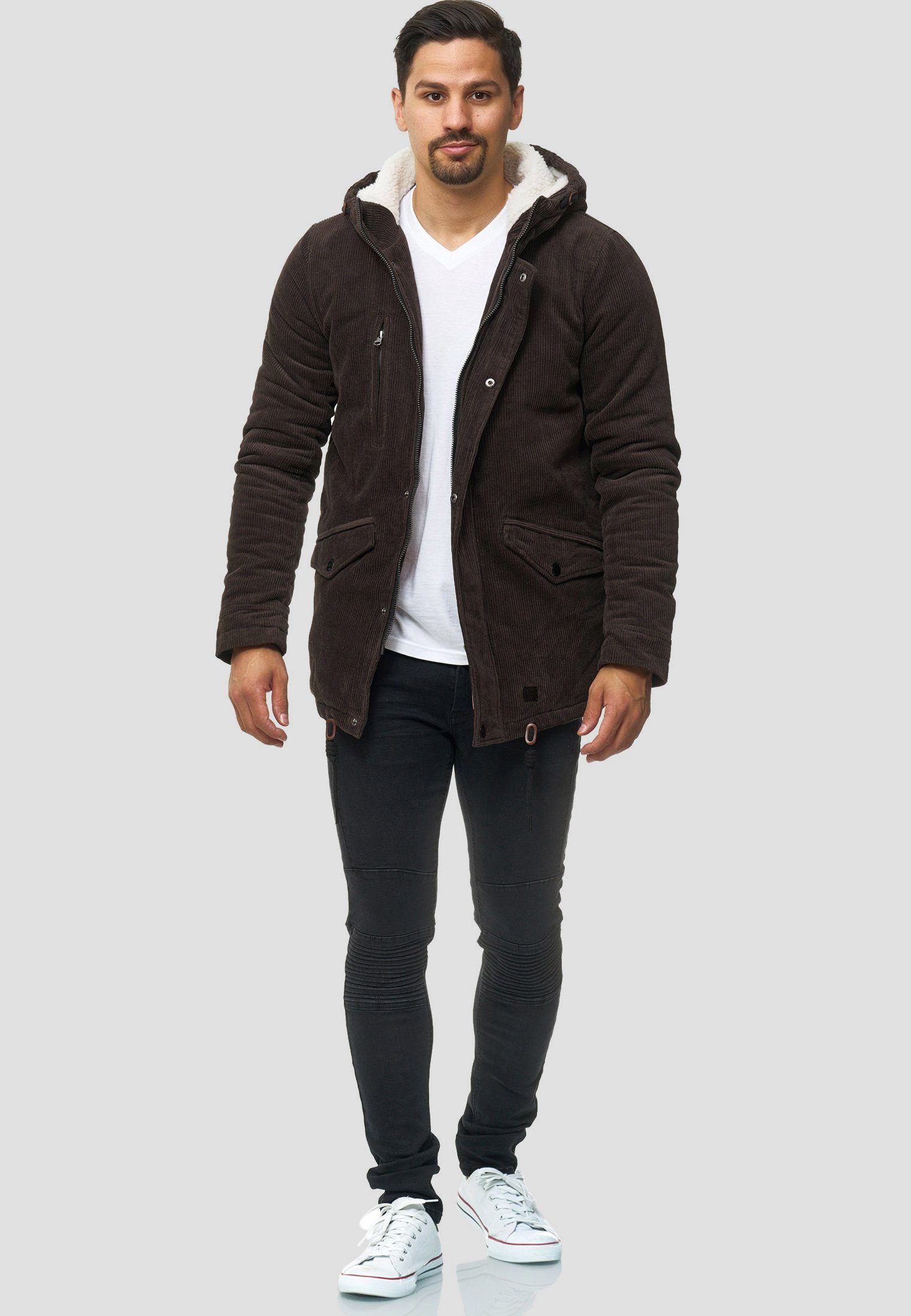 Die Jacke besteht aus einem strukturierten Cordstoff, der ihr eine klassische und zugleich robuste Optik verleiht. Sie hat einen längeren, leicht taillierten Schnitt, der an einen Parka erinnert und für eine gute Passform sorgt. Die Kapuze ist mit einem weichen, wärmenden Futter ausgestattet und kann mithilfe von Kordelzügen angepasst werden. Der Frontverschluss besteht aus einem stabilen Reißverschluss, der zusätzlich durch eine Knopfleiste geschützt wird, um besseren Windschutz zu bieten. An der Vorderseite befinden sich zwei schräge Pattentaschen mit Druckknöpfen, die praktischen Stauraum bieten. Zudem gibt es eine vertikale Brusttasche mit Reißverschluss, die sich für kleinere Wertsachen eignet. Die Ärmelenden sind mit versteckten elastischen Einsätzen versehen, die für zusätzlichen Schutz vor Kälte sorgen. Am Saum befindet sich ein verstellbarer Kordelzug, mit dem die Passform individuell angepasst werden kann. Insgesamt handelt es sich um eine stilvolle und funktionale Jacke, die sowohl Wärme als auch Komfort bietet.
