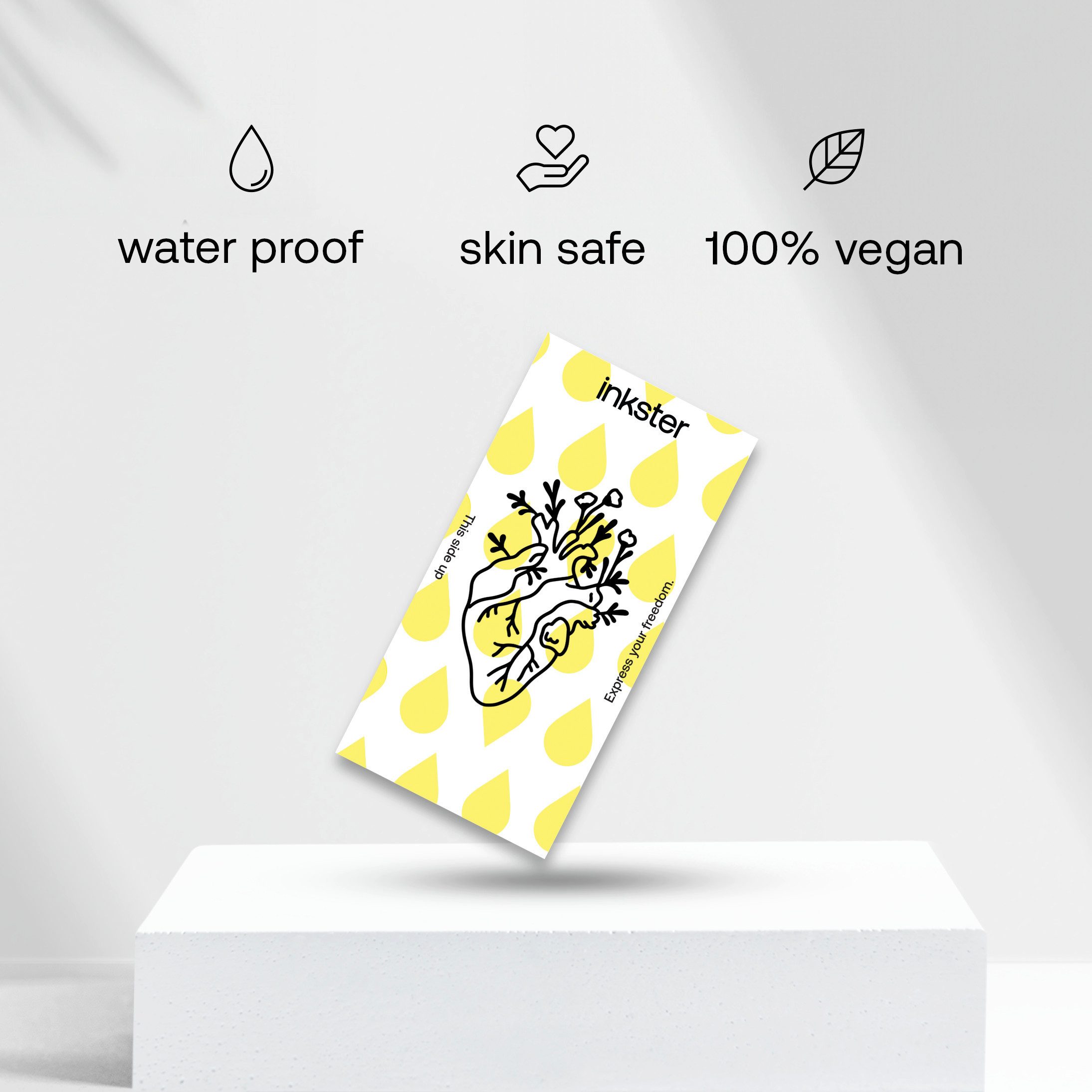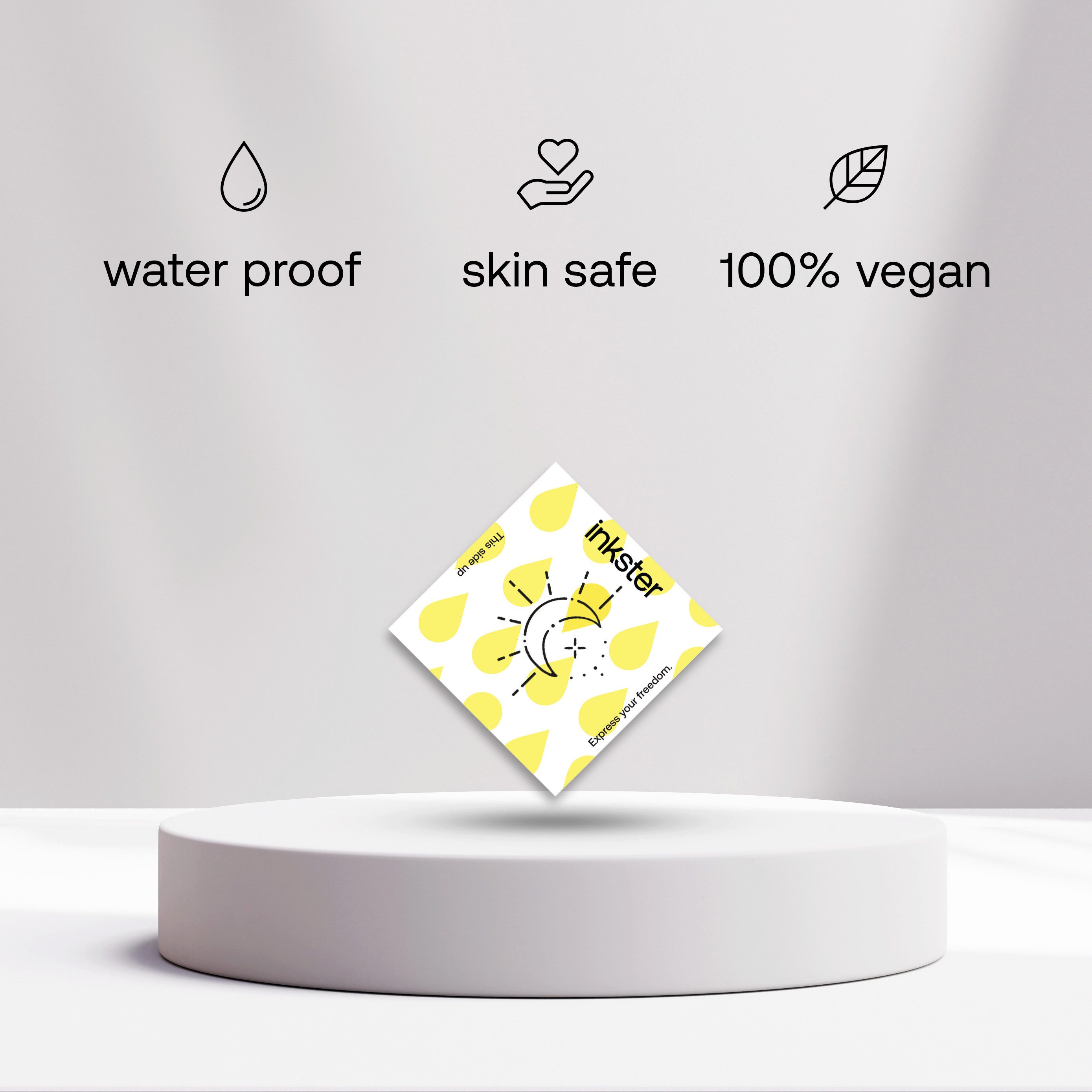 Die neuen revolutionären Inkster-Tattoos lassen sich wie Sticker auftragen, ziehen aber in die erste Hautschicht ein. Das Auftragen des Inkster-Tattoos ist in 1-2 Minuten erledigt. Da dein Inkster-Tattoo in die erste Hautschicht einzieht, kann Wasser deinem Tattoo nichts anhaben. Um deine Haut zu schützen, basiert unsere Tinte auf pflanzlicher Basis mit natürlichen Inhaltsstoffen. Dein Inkster-Tattoo ist, abhängig von der Position am Körper, 10-14 Tage sichtbar.