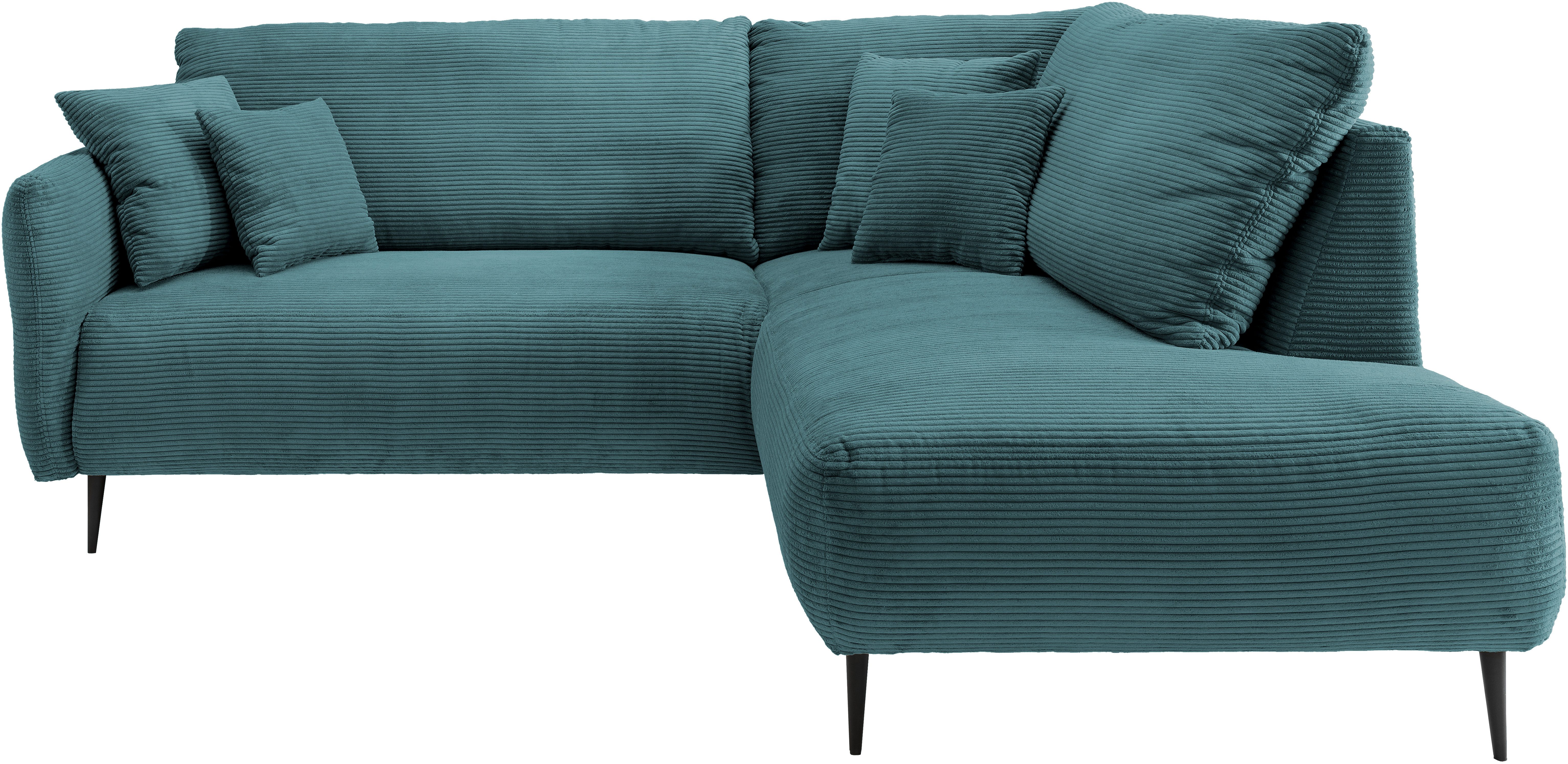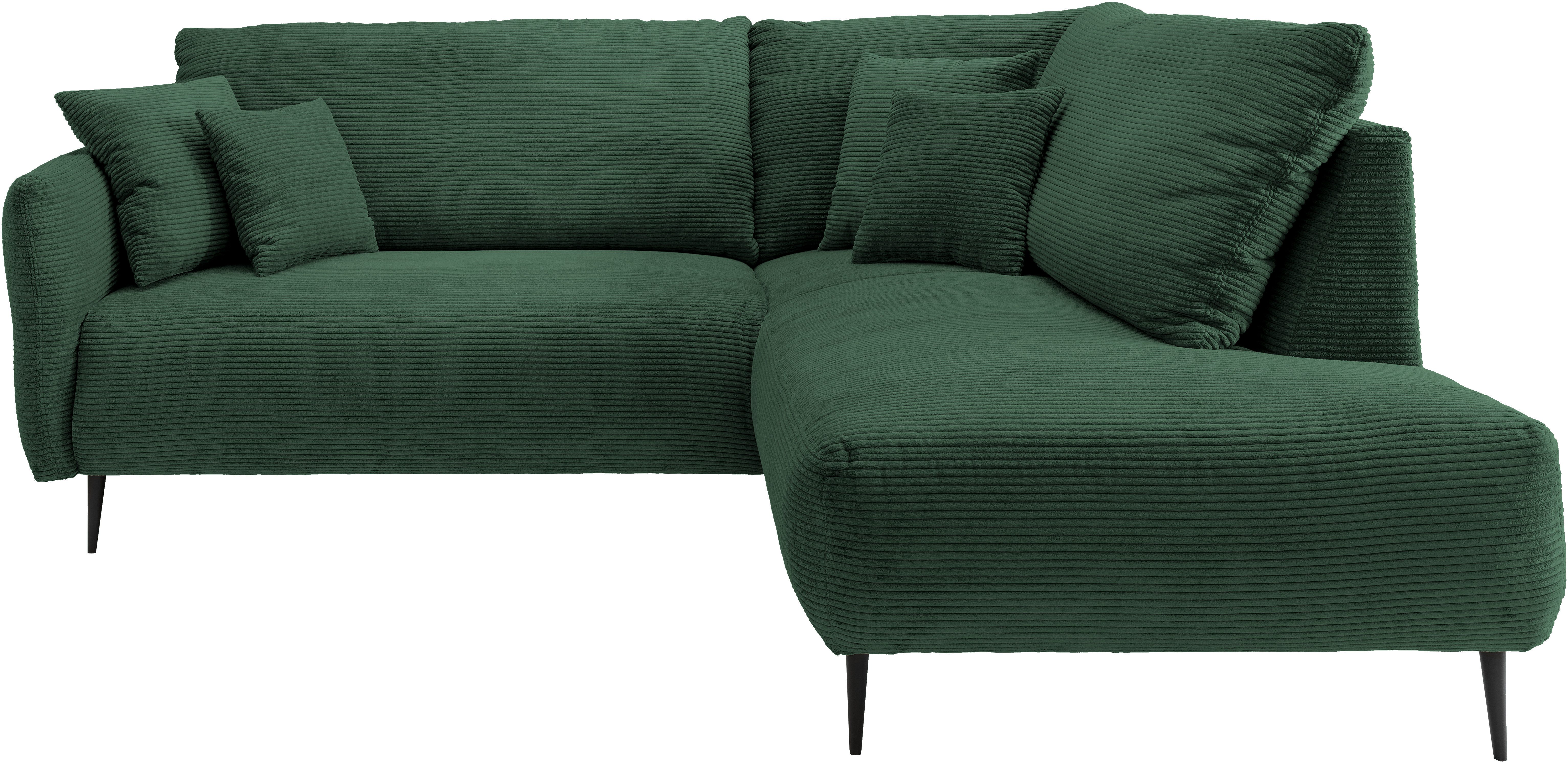 Durch die hochwertige Wellenunterfederung wird die Sitzfläche des Ecksofas »Vanilla L-Form« von INOSIGN gut gefedert und bleibt dauerhaft elastisch. Was dir auch zu Gute kommt, ist das passende Rückenkissen, die nicht nur schöne Deko-Element sind, sondern auch für noch mehr Komfort sorgen. Die Couch ist manuell verstellbar und lässt sich so mit wenigen Handgriffen in die gewünschte Position bringen. Von vorne betrachtet ist die Ottomane nach rechts ausgerichtet. Bei etwa 120 Kilogramm liegt die maximale Belastbarkeit pro Sitzplatz. Aus Metall gefertigt sind die schwarzen Füße besonders widerstandsfähig und langlebig.