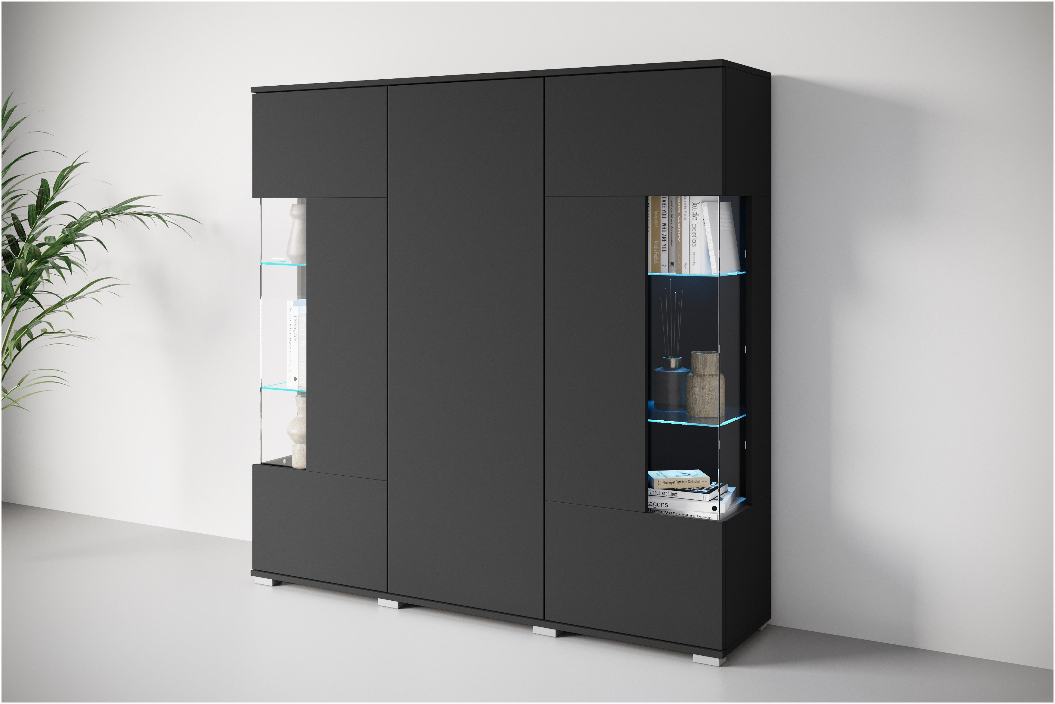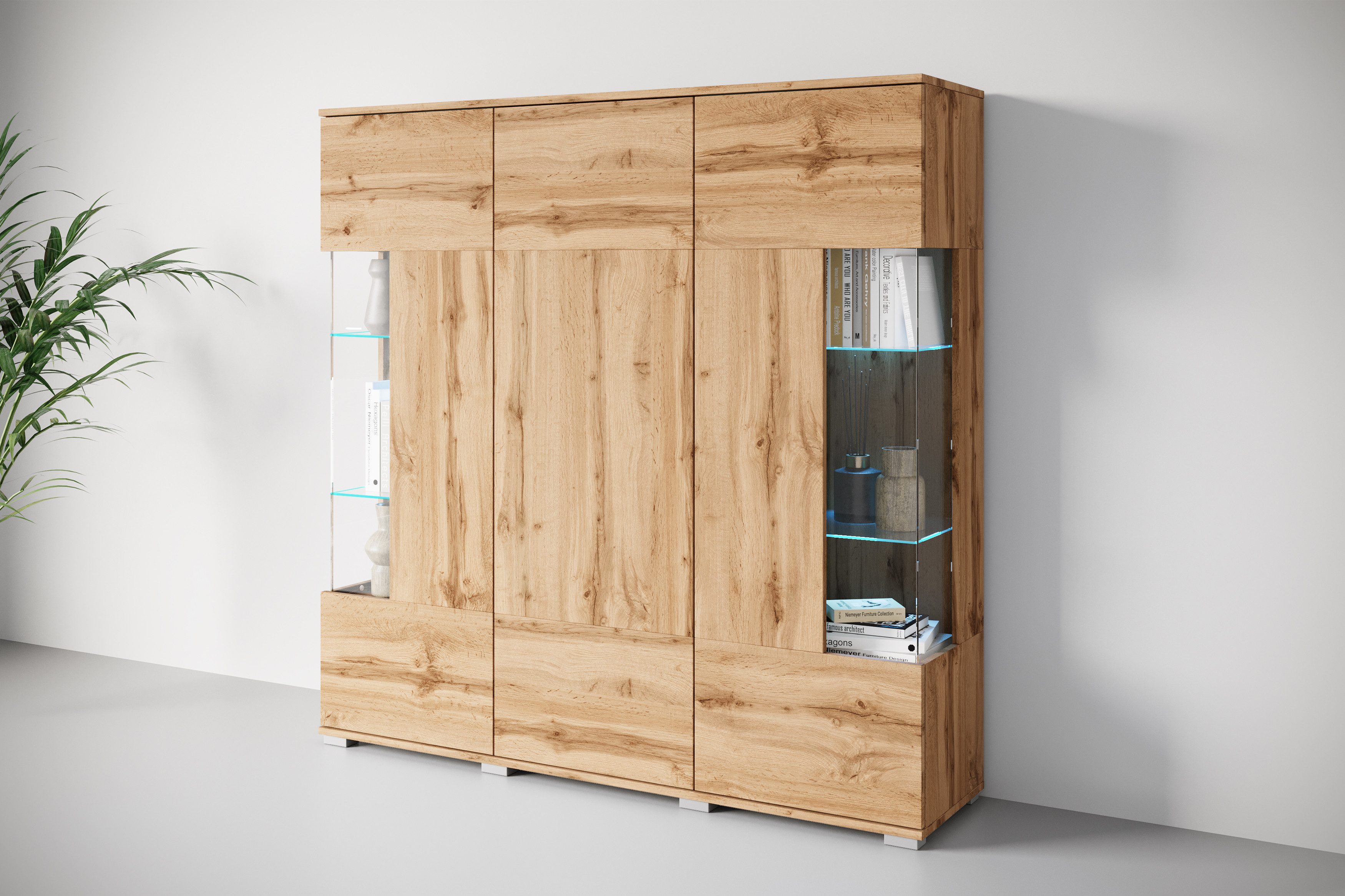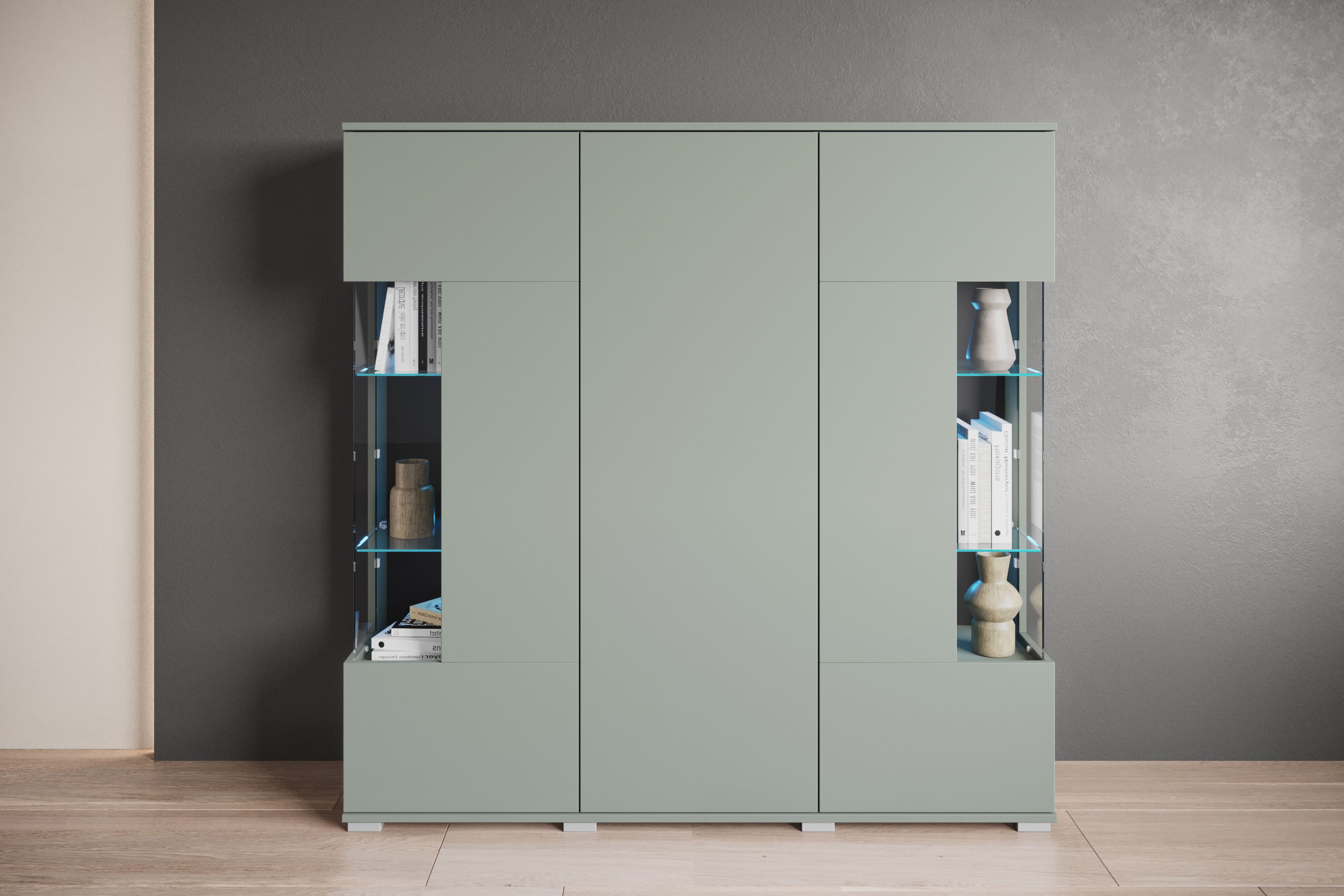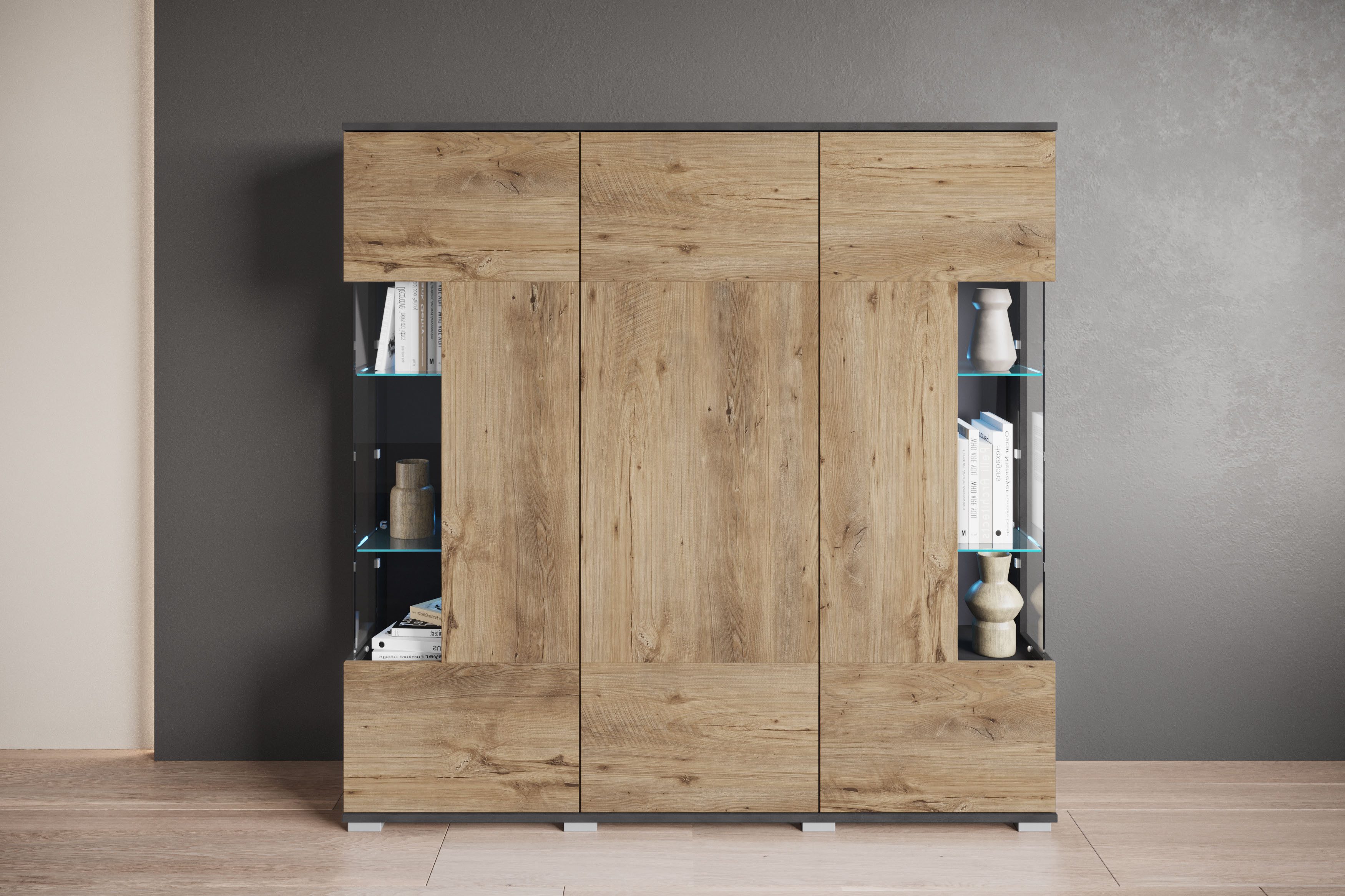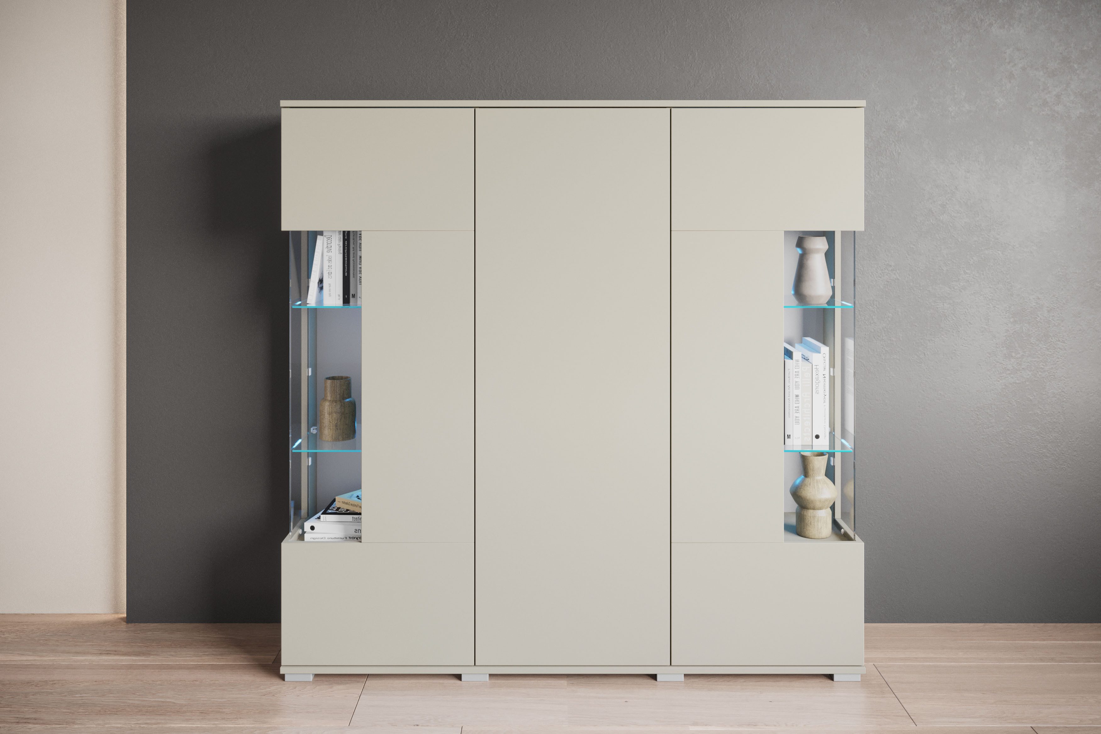 Modern designt, lässt sich das Highboard mit vielen Einrichtungsstilen harmonisch kombinieren. Um den trendigen Wohnstil zu unterstreichen und noch gemütlicher zu gestalten, sind zum Beispiel Pastellfarben empfehlenswert. Auch Accessoires wie Glas oder Naturstein passen gut. Es ist Teil der KENIA Serie. Впередe Artikel hieraus lassen sich besonders gut dazu kombinieren.