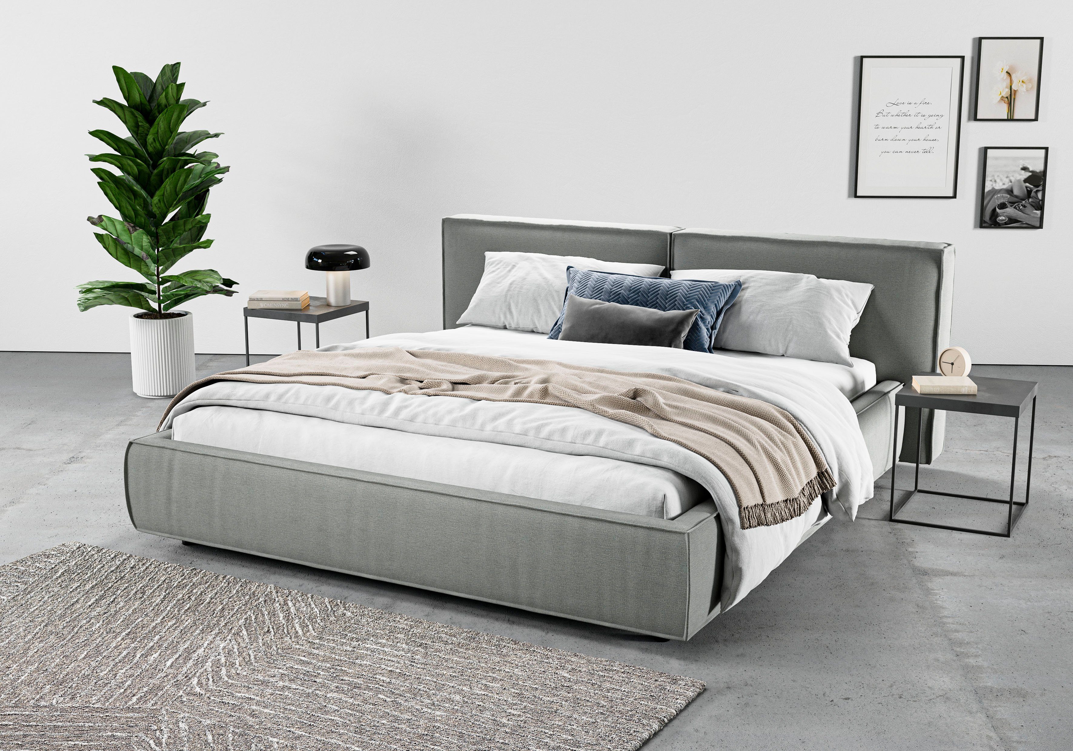 Um das industrielle Designdes Polsterbetts stilecht zu kombinieren, eignen sich Metallelemente, die für eine charakteristische Atmosphäre sorgen. Um Highlights zu setzen, eignen sich beispielsweise farbige Dekokissen und Lichterketten, die schöne Akzente setzen. Das Produkt ist Teil der Adrina Serie. Впередe Artikel aus der Serie lassen sich gut dazu kombinieren.