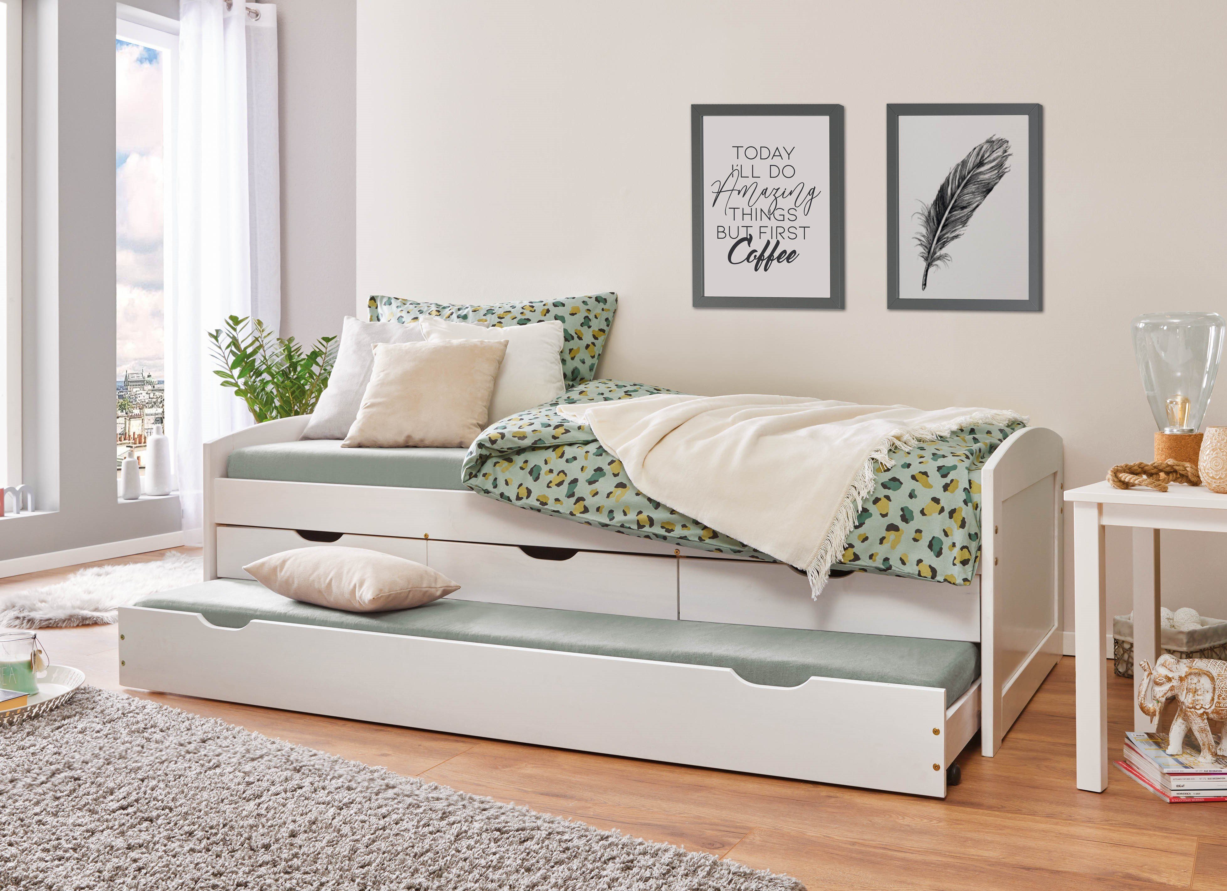 Wissenswertes | Entdecken Sie das vielseitige Funktionsbett "Ulli"! Dieses hochwertige Bett aus Massivholz bietet Ihnen nicht nur eine großzügige Liegefläche von 90x200 cm für erholsamen Schlaf, sondern auch drei praktische herausziehbare Schubladen für zusätzlichen Stauraum. Sie können bequem Bettwäsche, Kleidung und persönliche Gegenstände verstauen und haben alles griffbereit. Aber das ist noch nicht alles! "Ulli" hat eine zusätzliche ausziehbare Liegefläche, perfekt für Gäste oder wenn Sie mehr Platz benötigen. Das Bett überzeugt nicht nur durch Funktionalität, sondern auch durch sein stilvolles Design aus Massivholz. Die Montage ist einfach und unkompliziert, dank der bebilderten Anleitung. Holen Sie sich das Funktionsbett "Ulli" und erleben Sie den Komfort, den Stauraum und das attraktive Design in Ihrem Schlafzimmer! |