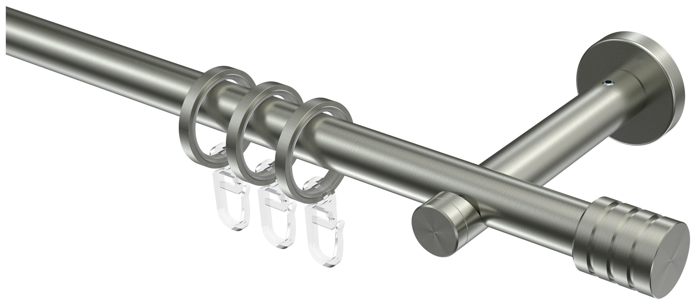 Lieferumfang | Endstücke "Rillenkappe" Edelstahl Flachringe Edelstahl-Optik inkl. Einlage und Faltenlegehaken Rohr 100 cm Edelstahl Träger 1-läufig Edelstahl inkl. Befestigungsmaterial |
