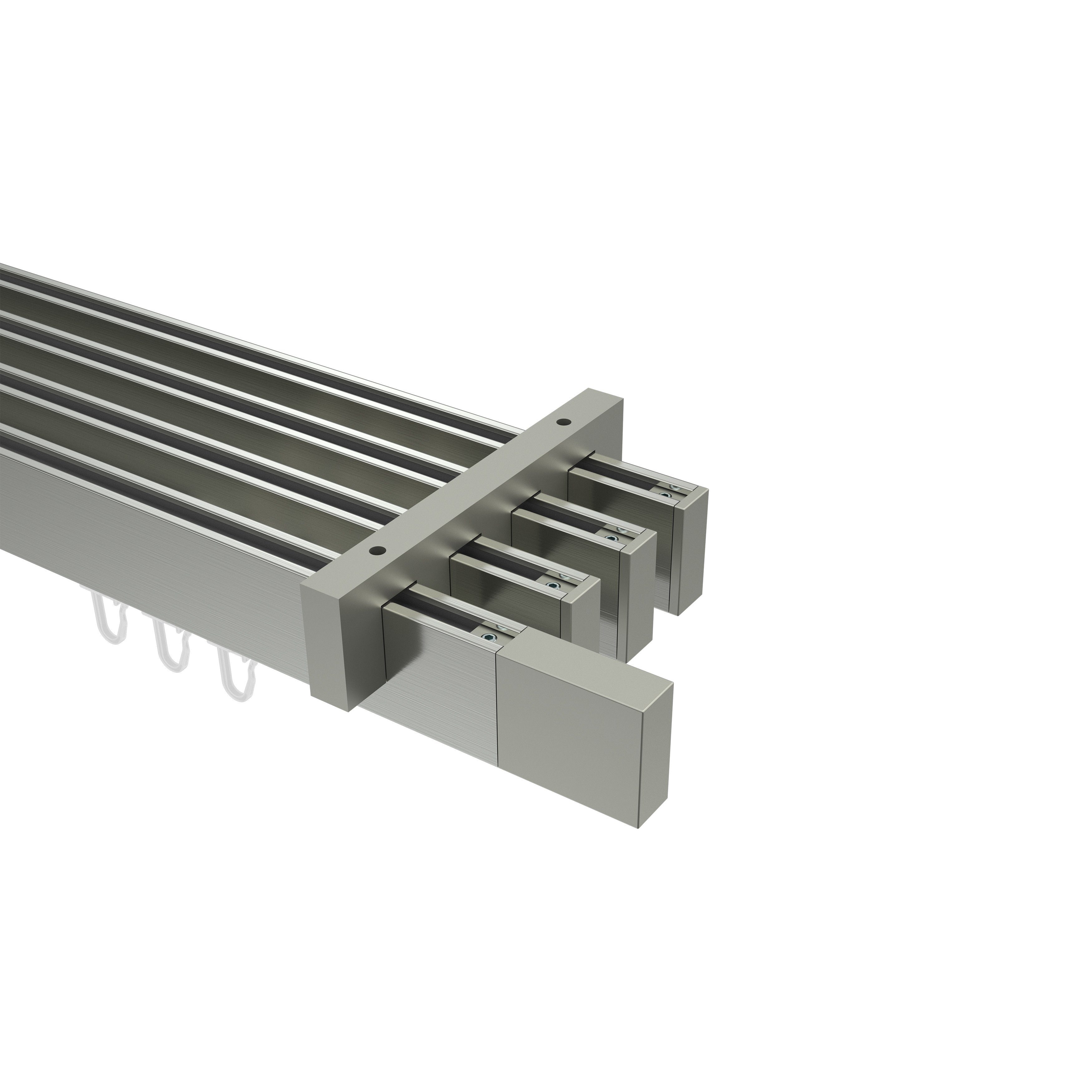 Diese kantige Innenlauf-Gardinenstange in Edelstahl-Optik bringt den Trend der schlichten Form in die Fensterdekoration ein. Die Innenlaufstangen des Modells Smartline Lox in vierläufiger Ausführung bestehen aus Aluminium und Metall und werden für die direkte Deckenmontage verwendet. Geliefert wird diese Innenlaufstange als Set, d. h. montagefertig inkl. Halter, Endstücke und Befestigungsmaterial. Die Gardinen bzw. Vorhänge werden mit dessen Kräusel- oder Gardinenband an den Faltengleitern befestigt. Material: Aluminium (Innenlaufprofil) / Metall (Zubehör) Farbe: Edelstahl-Optik Ausführung: vierläufig Profil (B x H): 14 x 35 mm Träger (Halterungen): Deckenträger mit ca. 1 cm Deckenabstand (Trägerabstand) Befestigungsmöglichkeit(en): Deckenbefestigung Lieferumfang: 4 Stk. Innenlaufprofile (bis 200 cm Довжина = ungeteilt, größer als 200 cm bis 280 cm = geteilt in 2 Teilstücke pro Lauf, 300 cm = geteilt in 3 Teilstücke pro Lauf, größer als 300 cm bis 400 cm = geteilt in 2 Teilstücke pro Lauf, größer als 400 cm bis 600 cm = geteilt in 3 Teilstücke pro Lauf), 2 Stk. Endstücke für dieses Modell (vordere Stange), 6 Stk. Endstücke (hintere Stange), 2 Stk. Träger (größer als 200 cm bis 280 cm = 3 Stk. Träger, 300 cm = 4 Stk. Träger, größer als 300 cm bis 400 cm = 3 Stk. Träger, größer als 400 cm bis 600 cm = 4 Stk. Träger), Faltengleiter mit Faltenlegehaken (1 Stk. Faltengleiter mit Faltenlegehaken pro 10 cm Stangenlänge je Lauf) u. Befestigungsmaterial. Zwischengrößen, Überlängen und Spezialanfertigungen auf Anfrage. Die oben angegebenen Größen beziehen sich auf die reine Stangenlänge zzgl. der Endstücke. Herstellerhinweis, Empfehlung und Farbhinweis: Abhängig von Verwendung kann es unter Umständen möglich sein, dass unabhängig vom Lieferumfang und Розмір ein zusätzlicher Zwischenträger erforderlich sein kann. Die Farbwiedergabe der Abbildung bzw. des Bildmaterials kann eventuell von den Original Farben abweichen. Dieses könnte unter anderem von den Einstellungen Ihrer Grafikkarte und Ihres Monitors abhängig sein.
