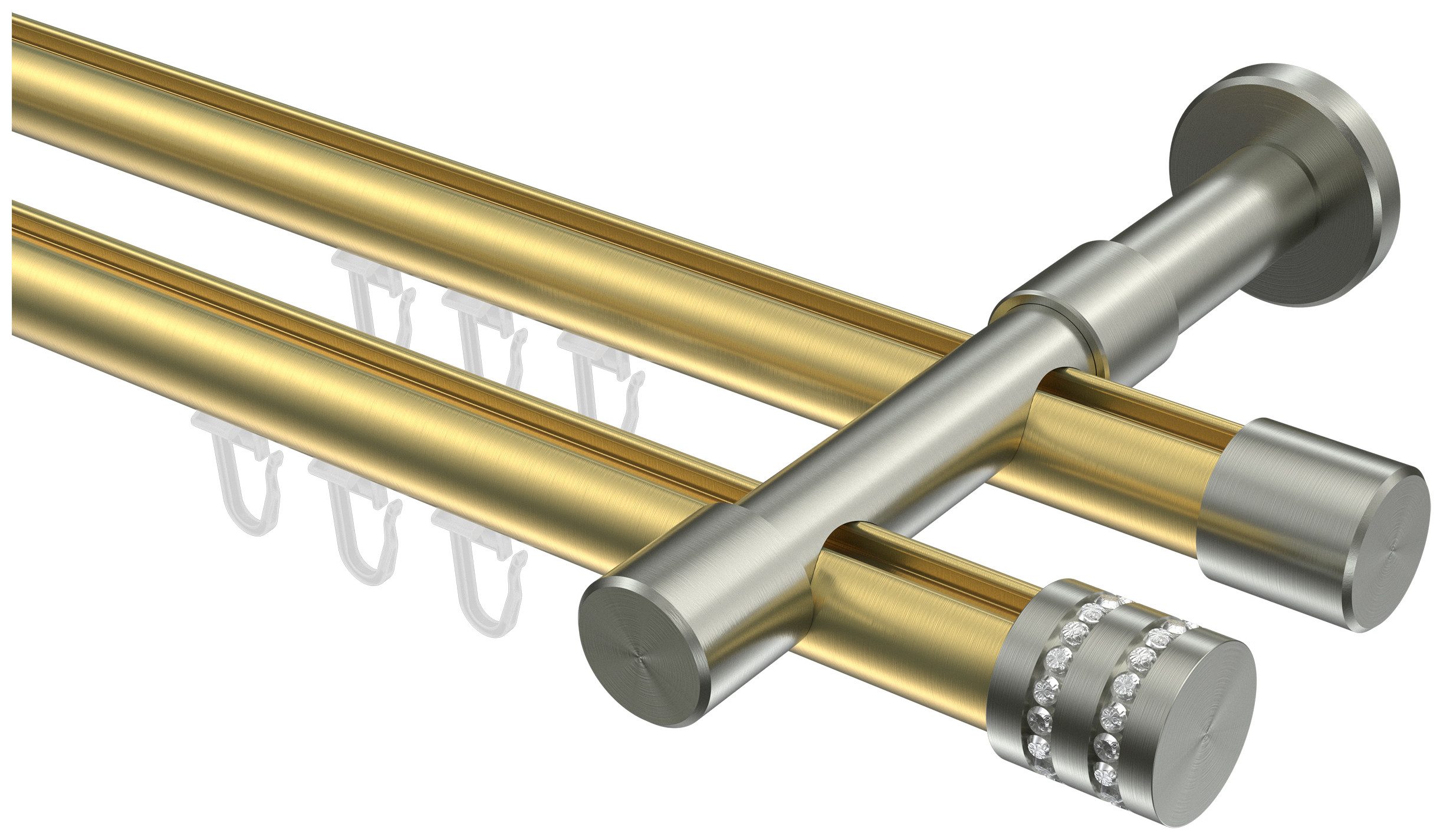 Lieferumfang | Endstücke "Glitzerkappe" Edelstahl-Optik Endstücke "Kappe" Edelstahl-Optik Faltengleiter mit Faltenlegehaken Innenlaufprofile 100 cm Messing-Optik Träger 2-läufig Edelstahl-Optik inkl. Befestigungsmaterial |