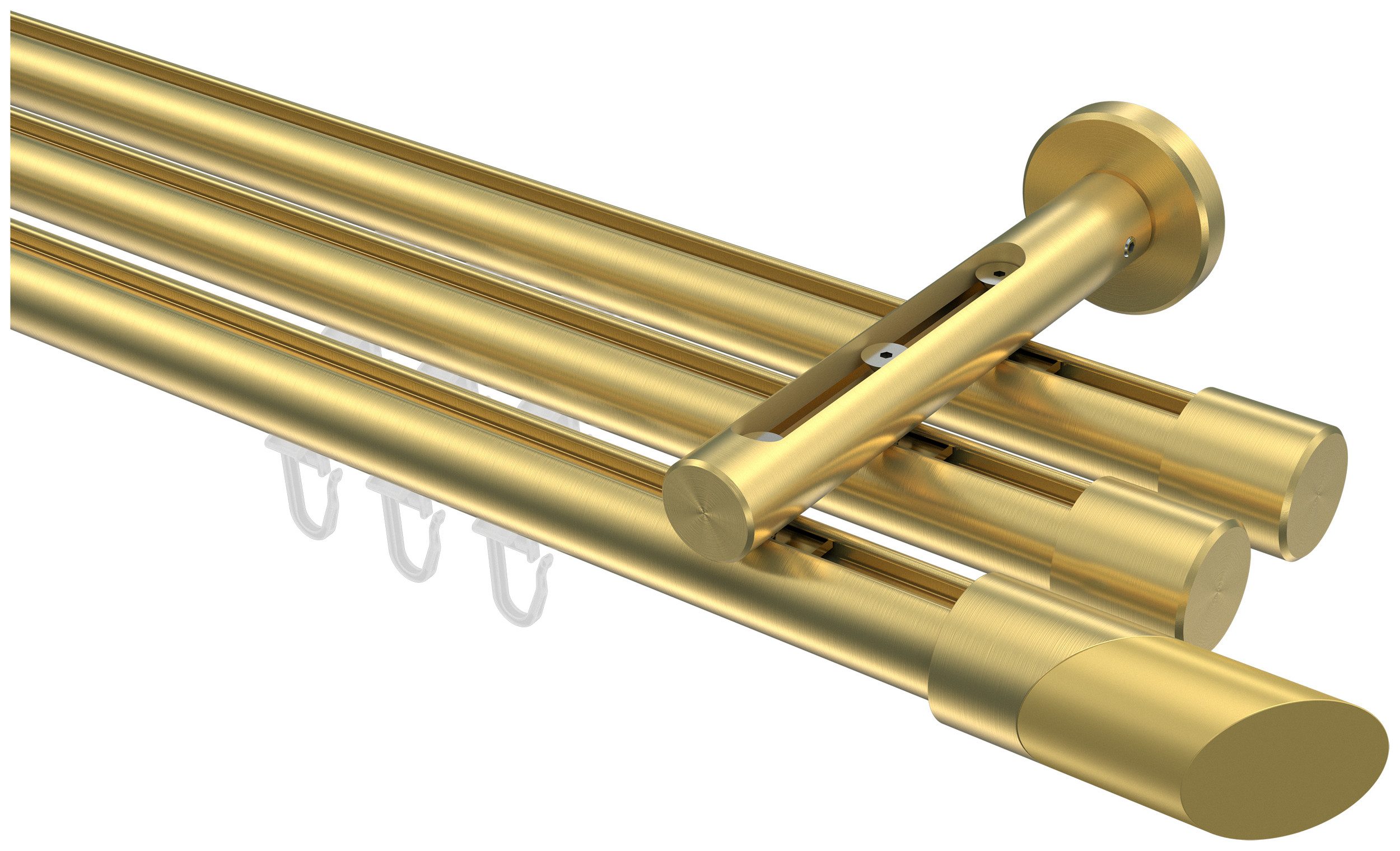 Lieferumfang | Endstücke "Kappe" Messing-Optik Endstücke "Schräge / Bicolor" Messing-Optik/Satin-Gold Faltengleiter mit Faltenlegehaken Innenlaufprofil 100 cm Messing-Optik Träger 1-3-läufig Langloch Messing-Optik inkl. Befestigungsmaterial |