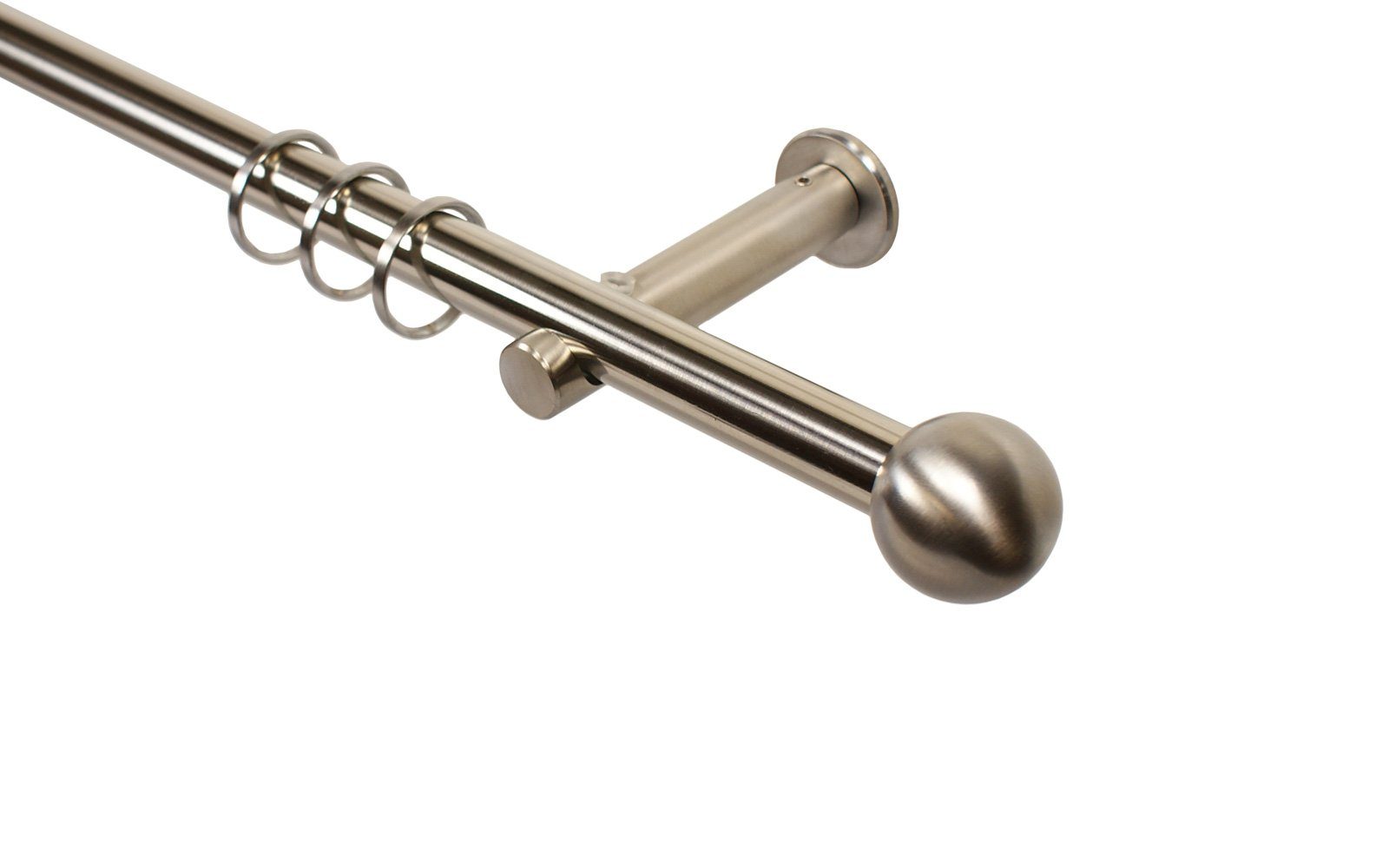 Beschreibung | Das Gardinenstangenset besteht aus dem Edelstahlrohr sowie den Wandhalter, Endstücken und Ringen aus Metall in der Farbe Edelstahl. |