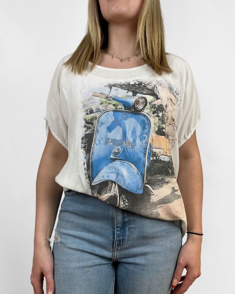 Das ITALY VIBES T-Shirt BIANCA mit Print und Strasssteinen ist ein modisches Statement. Es bietet eine oversize Passform und lässt sich vielseitig kombinieren – perfekt für lässige Outfits oder als trendiges Highlight.