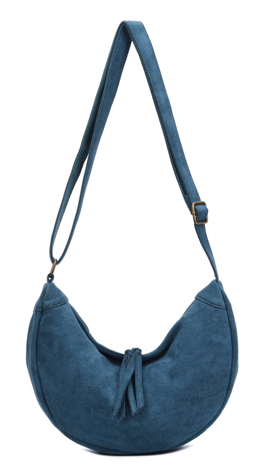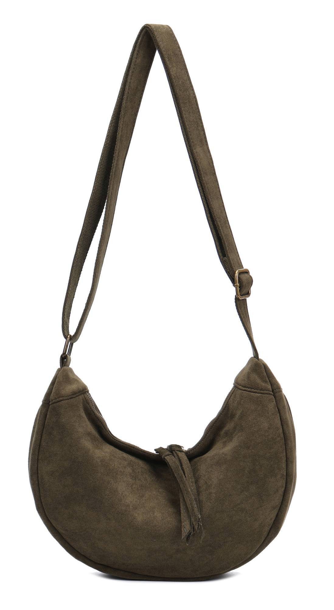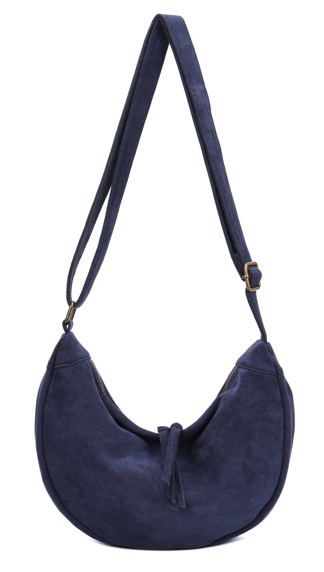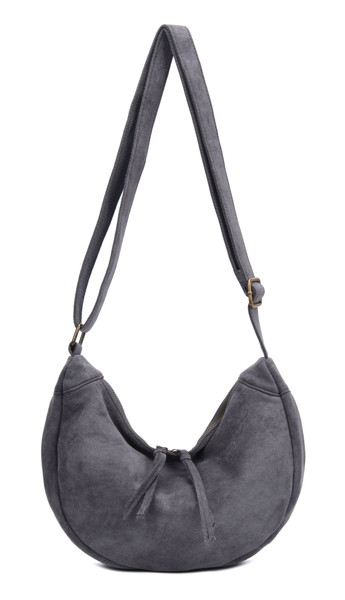 Diese stilvolle Umhängetasche, die an eine moderne Interpretation einer Hobo-Bag erinnert, besticht durch ihre einzigartige, halbmondförmige Silhouette.