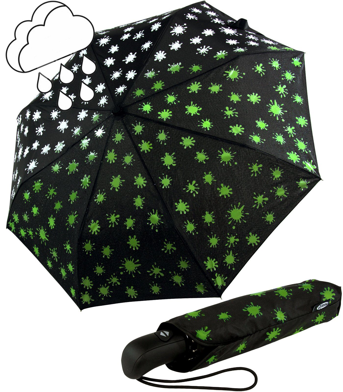 Dieser extravagante Taschenschirm ist mit einem besonderen Aufdruck versehen, der sich bei Nässe verändert. Die weißen Farbkleckse auf schwarzem Hintergrund ändern ihre Farbe zu grün, wenn Regen auf das Schirmdach fällt. Dieser Effekt ist ein echter Hingucker. So macht Regenwetter richtig Spaß. Trocknet der Schirm, färben sich die Kleckse wieder weiß. Die Farbe des Schirmdaches ist schwarz-weiß, bei Nässe schwarz-neongrün, das verwendete Material besteht aus 100% Polyester. Groß und stabil wiegt der Schirm ca. 360 Gramm. Geöffnet ist das Schirmdach 97 cm groß. Geschlossen misst der Regenschirm 29 cm. Dieser Taschenschirm für Damen besitzt ein stabiles und flexibles Stahlgestell mit Fiberglaskomponenten in modernem Schwarz. Geöffnet und geschlossen wird das große Dach per Knopfdruck. Um den Federmechanismus der Auf-Zu-Automatik neu zu spannen, muss lediglich der Teleskopstock wieder zusammen geschoben werden. Der schwarze rutschfeste Griff ist ergonomisch so gestaltet, dass der Schirm sehr gut in der Hand liegt, womit sich der Schirm auch lange Zeit angenehm tragen lässt.
