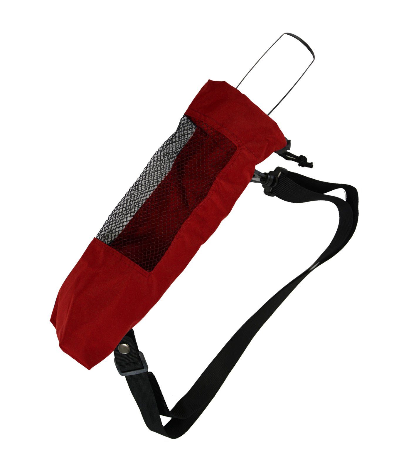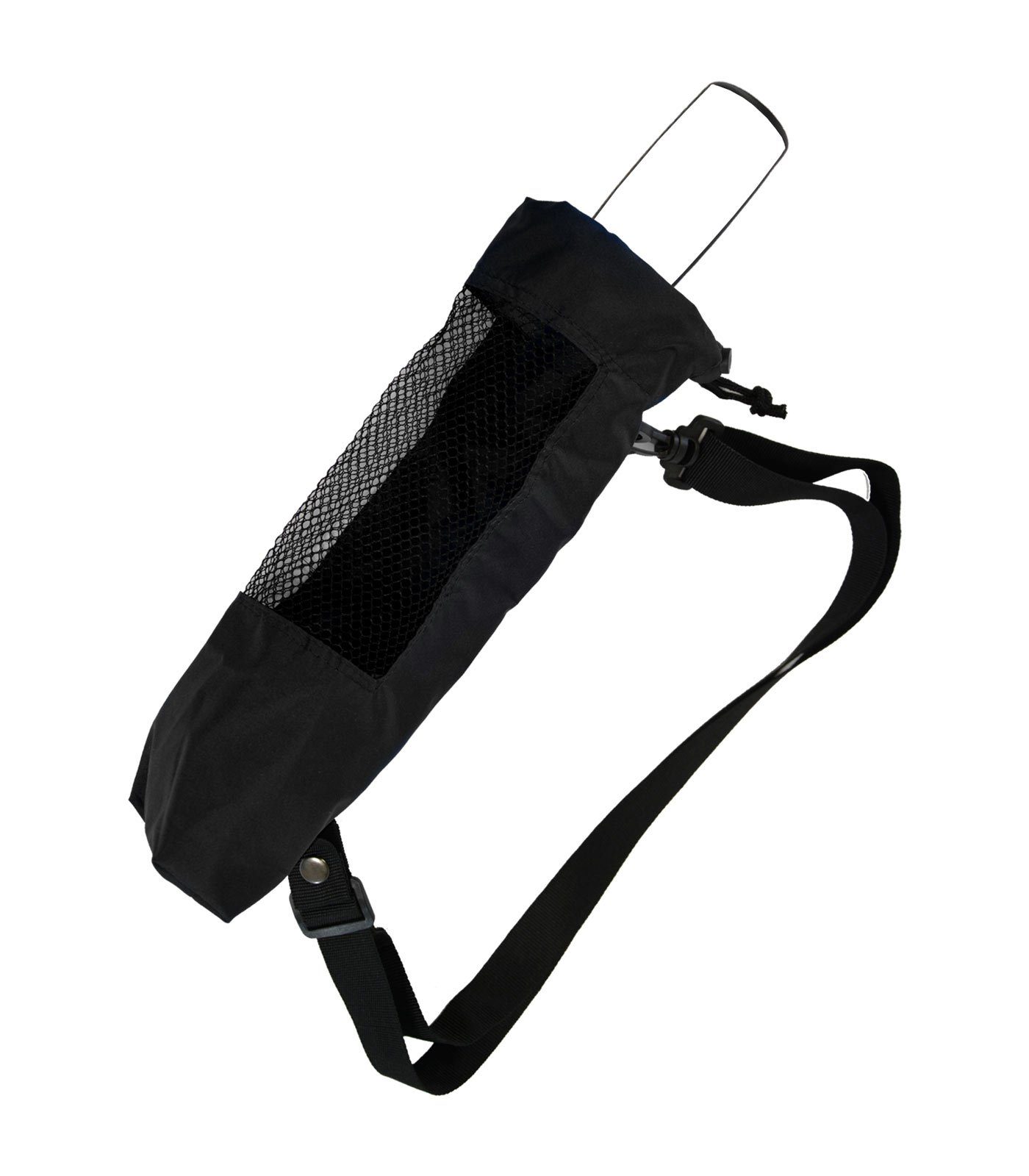 Die Schirmhülle besteht aus robustem Stoff mit Maschengewebe an der Seite und einem Kordelzug an der Oberseite. Durch den längenverstellbaren Umhängeriemen können Sie Ihren Taschenschirm bequem über der Schulter tragen, wenn Sie momentan keinen Schutz vor den Elementen brauchen. Sollten Sie keinen Riemen benötigen, kann er einfach durch den Druckknopf und den Karabinerhaken entfernt werden.