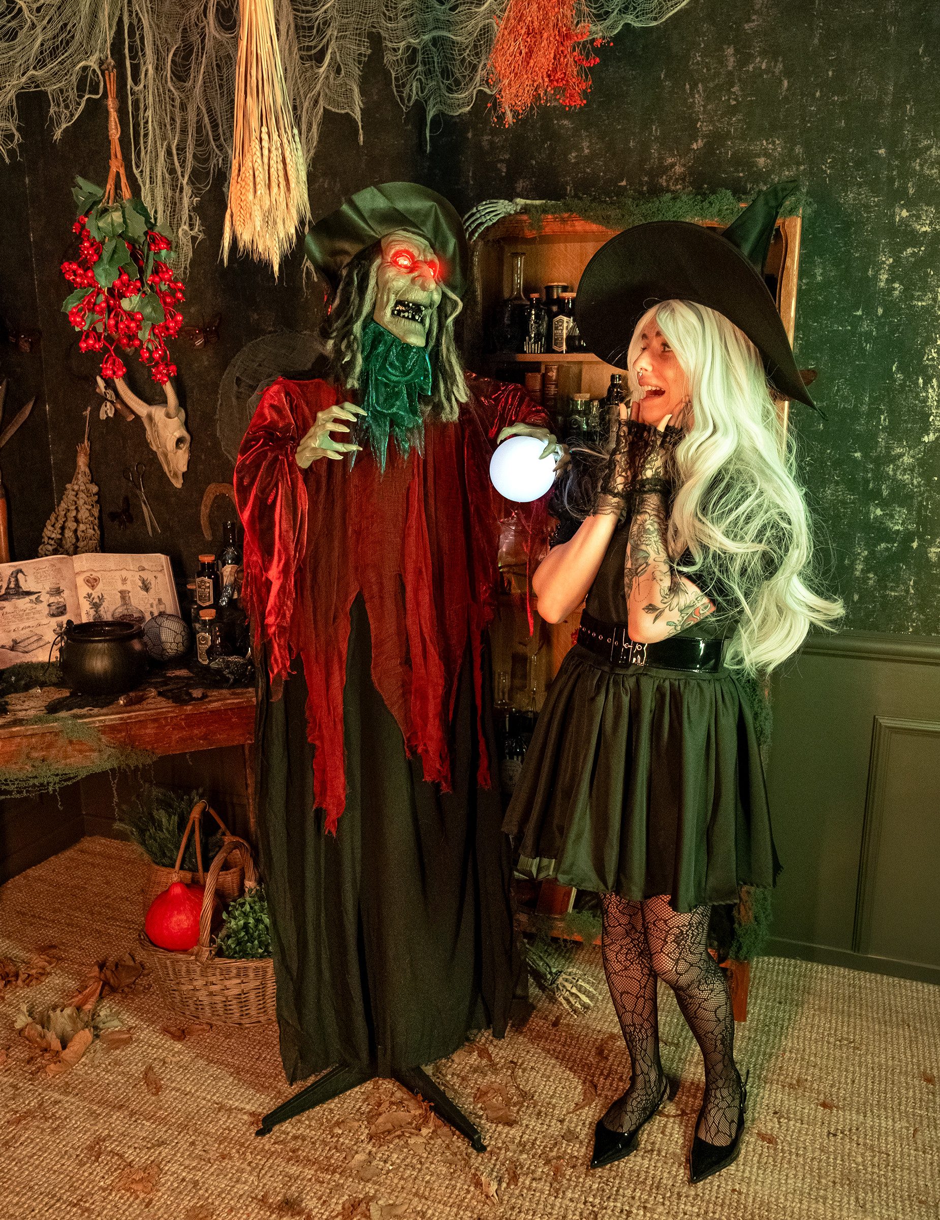 Diese 168 cm hohe, animierte Dekofigur Hexe beeindruckt mit einer düsteren und bedrohlichen Erscheinung. Ihr grimmiges Gesicht, dunkle Haare sowie das violett-schwarz zerrissene Gewand betonen ihren Charakter als schwarze Priesterin. Sobald Umgebungsgeräusche erkannt werden, beginnt ihr Kopf sich zu drehen, ihre Arme bewegen sich um eine leuchtende Kugel, und ein teuflischer Schrei ertönt. Funktioniert mit 3x AA-Batterien (nicht enthalten). Ein lebensechtes Halloween-Highlight für eine schaurige und unvergessliche Nacht.