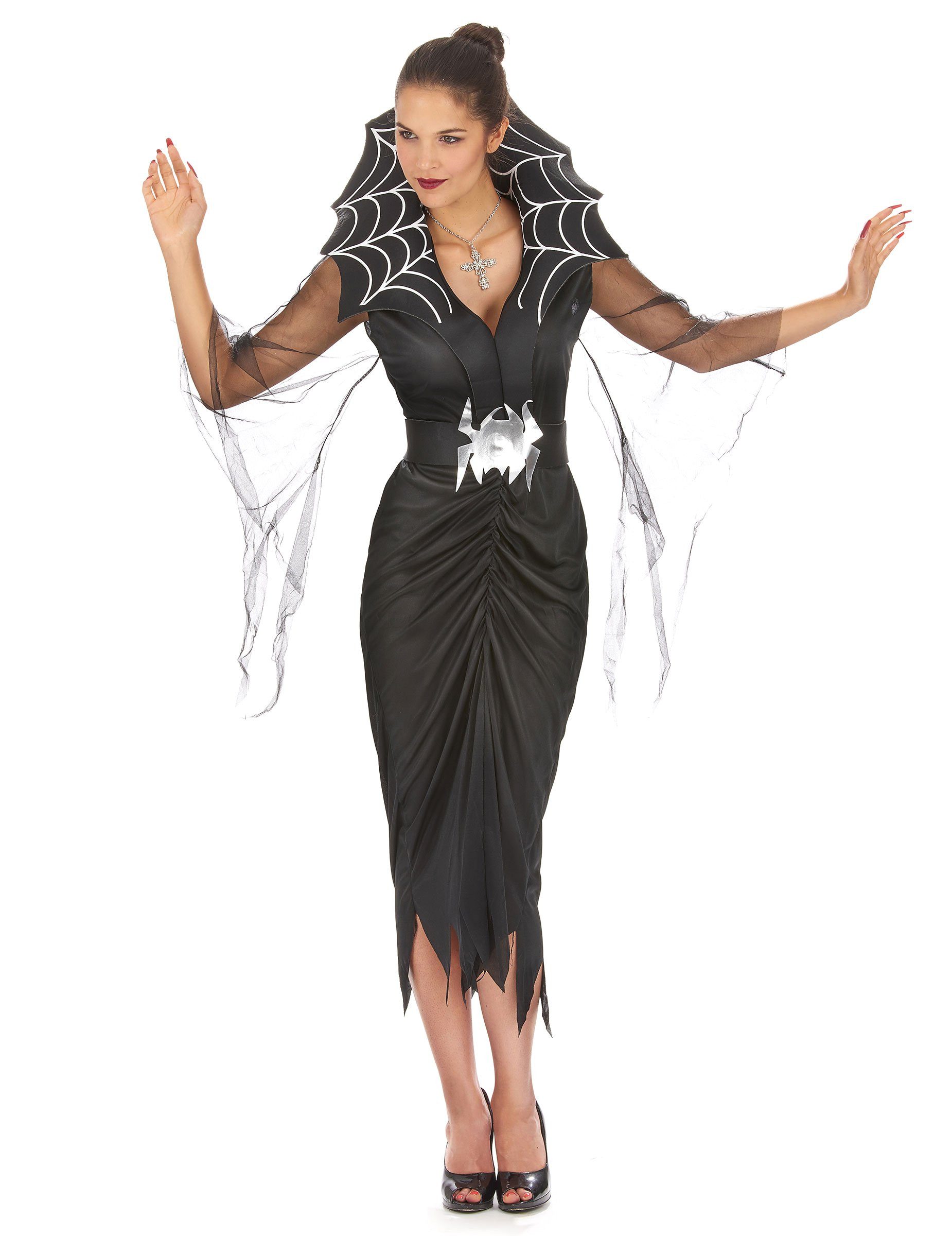 Dieses Spinnenfrau-Damenkostüm besteht aus einem langen, figurbetonten Kleid, das am unteren Saum zackig geschnitten ist. Die Schuhe und die Kette sind nicht im Lieferumfang enthalten. Außer dem gezackten Saum hat das Spinnenkleid noch weit ausgestellte Tüllärmel zu bieten, die das Geheimnisvolle des Damenkostüms hervorheben. Ein gezackter Stehkragen erinnert an Vampirkostüme, kommt aber mit weißen Spinnenweben - dazu passt der ebenfalls schwarze Gürtel mit einer silbernen Spinne auf Bauchhöhe. Ein tolles Halloween-Damenkostüm, mit dem Sie sich zur Königin der Spinnen verwandeln! Achtung! Nicht für Kinder unter drei Jahren geeignet. Kann Kleinteile enthalten - Erstickungsgefahr.